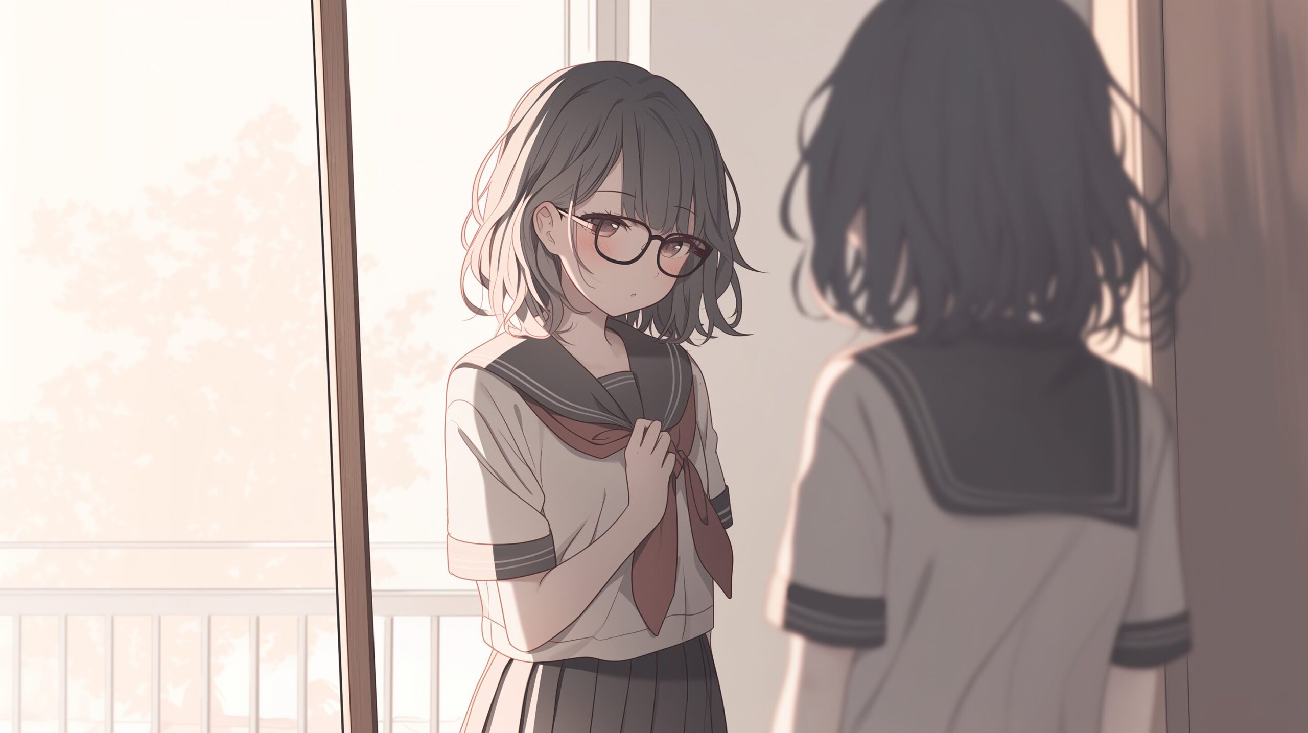 検索タグ:イラスト、キャラクター、女子、女の子、女性、女、女の人、アニメ、漫画、マンガ、若い、人物、顔、美しい、綺麗、きれい、キレイ、アート、お洒落、挿絵、インスタ、Instagram、AI生成画像、コピースペース、かわいい、可愛い、カワイイ、黒髪、橘、たちばな、ゆず、柚、キャラクター、ショートヘア、黒髪、メガネ、眼鏡、めがね、前髪ぱっつん、パッツン、JK、制服、セーラー服、恥ずかしい、照れる、赤面、鏡の前