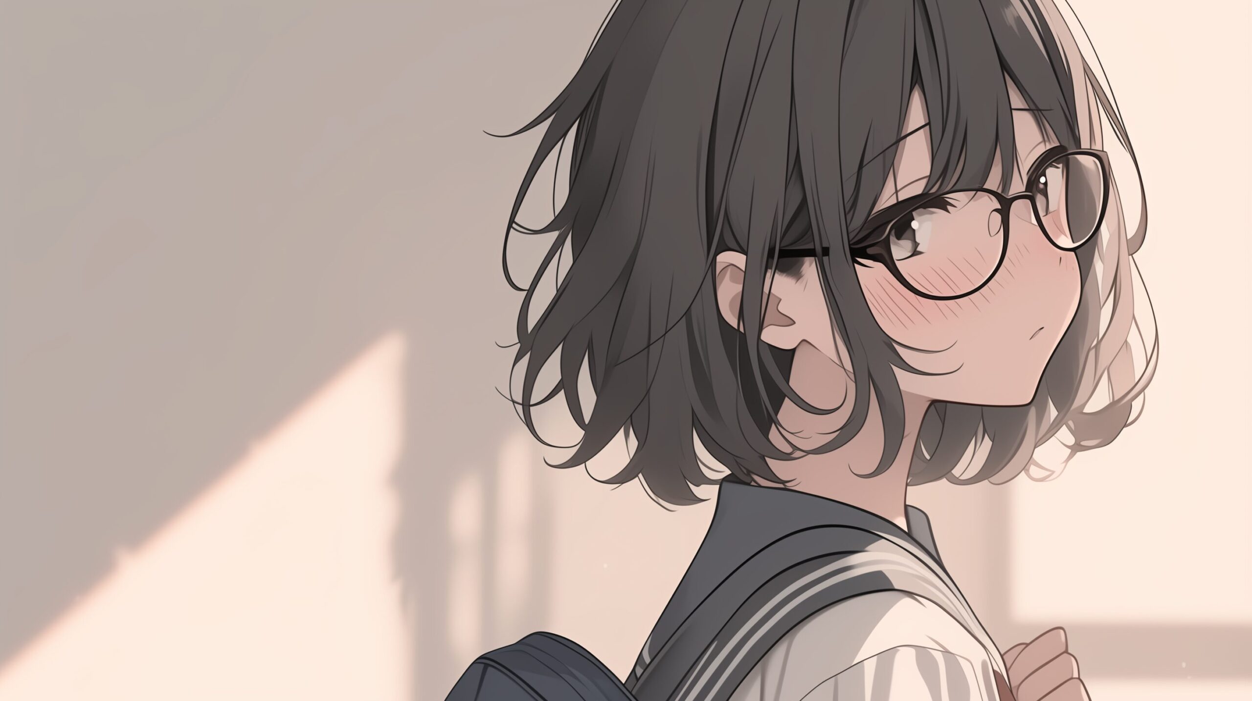 検索タグ:イラスト、キャラクター、女子、女の子、女性、女、女の人、アニメ、漫画、マンガ、若い、人物、顔、美しい、綺麗、きれい、キレイ、アート、お洒落、挿絵、インスタ、Instagram、AI生成画像、コピースペース、かわいい、可愛い、カワイイ、黒髪、橘、たちばな、ゆず、柚、キャラクター、ショートヘア、黒髪、メガネ、眼鏡、めがね、前髪ぱっつん、パッツン、JK、制服、セーラー服、恥ずかしい、照れる、赤面、鏡の前