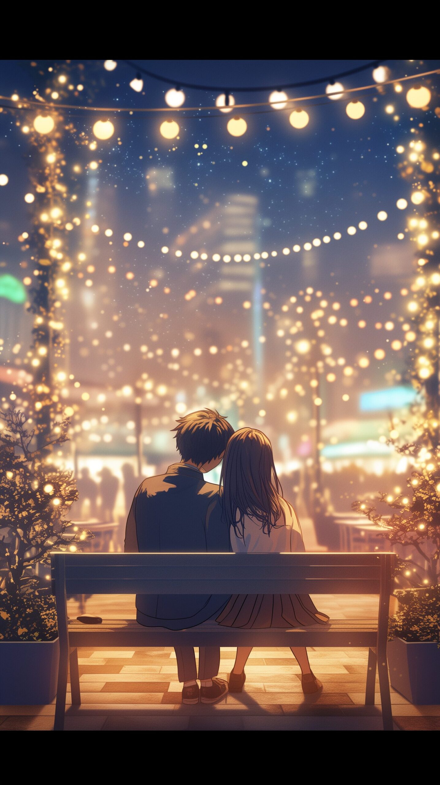 【スマホ壁紙】イルミネーションを眺めるカップルの後ろ姿イラスト・フリー素材01