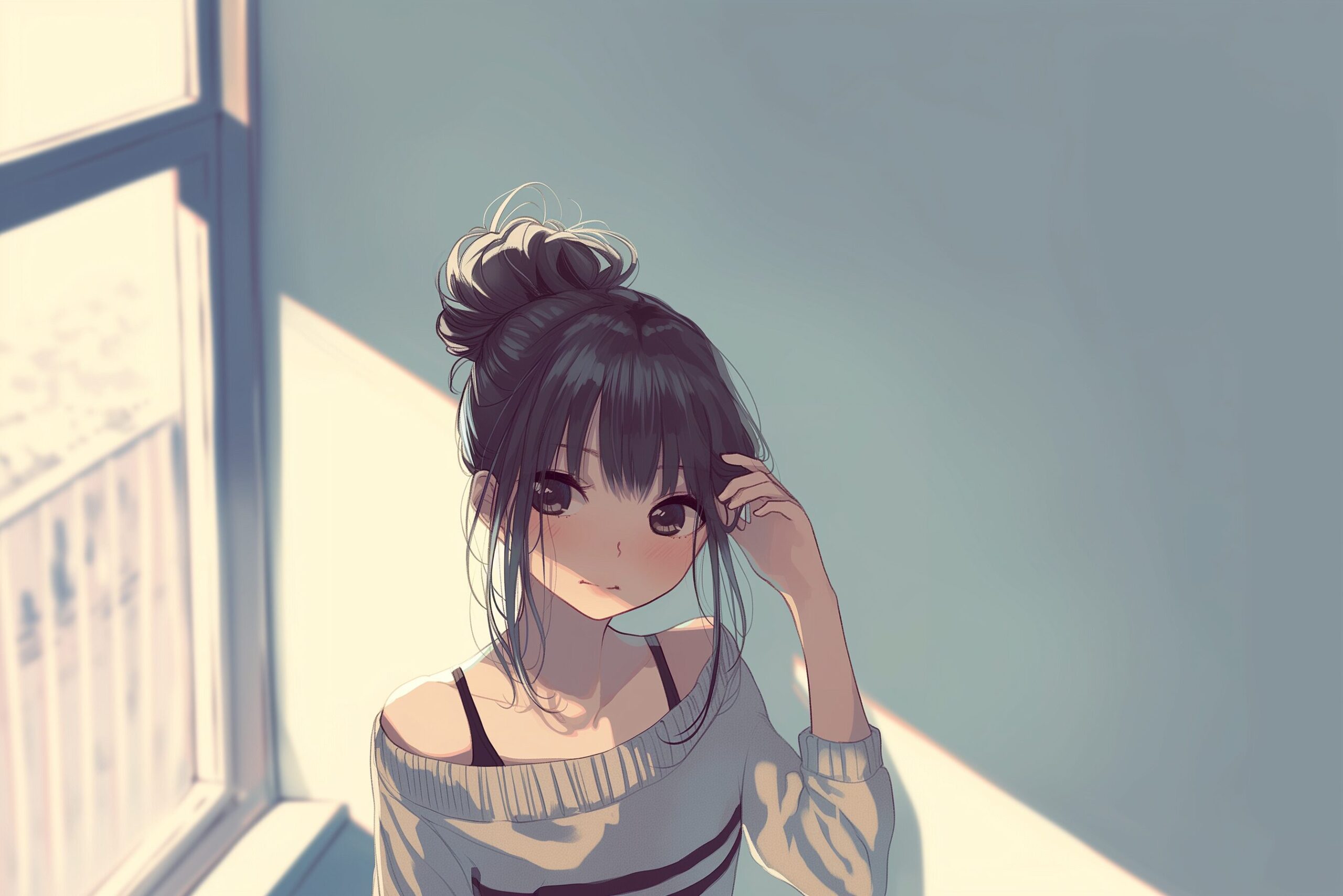 検索タグ:イラスト、キャラクター、女性、女、女の子、女子、女の人、アニメ、漫画、マンガ、美人、美女、若い、かわいい、可愛い、カワイイ、人物、顔、美しい、綺麗、きれい、キレイ、アート、お洒落、挿絵、インスタ、Instagram、AI生成画像、コピースペース、恋愛、恋、片思い、失恋、お団子ヘア、髪型、笑顔、微笑む、微笑み、後ろ姿