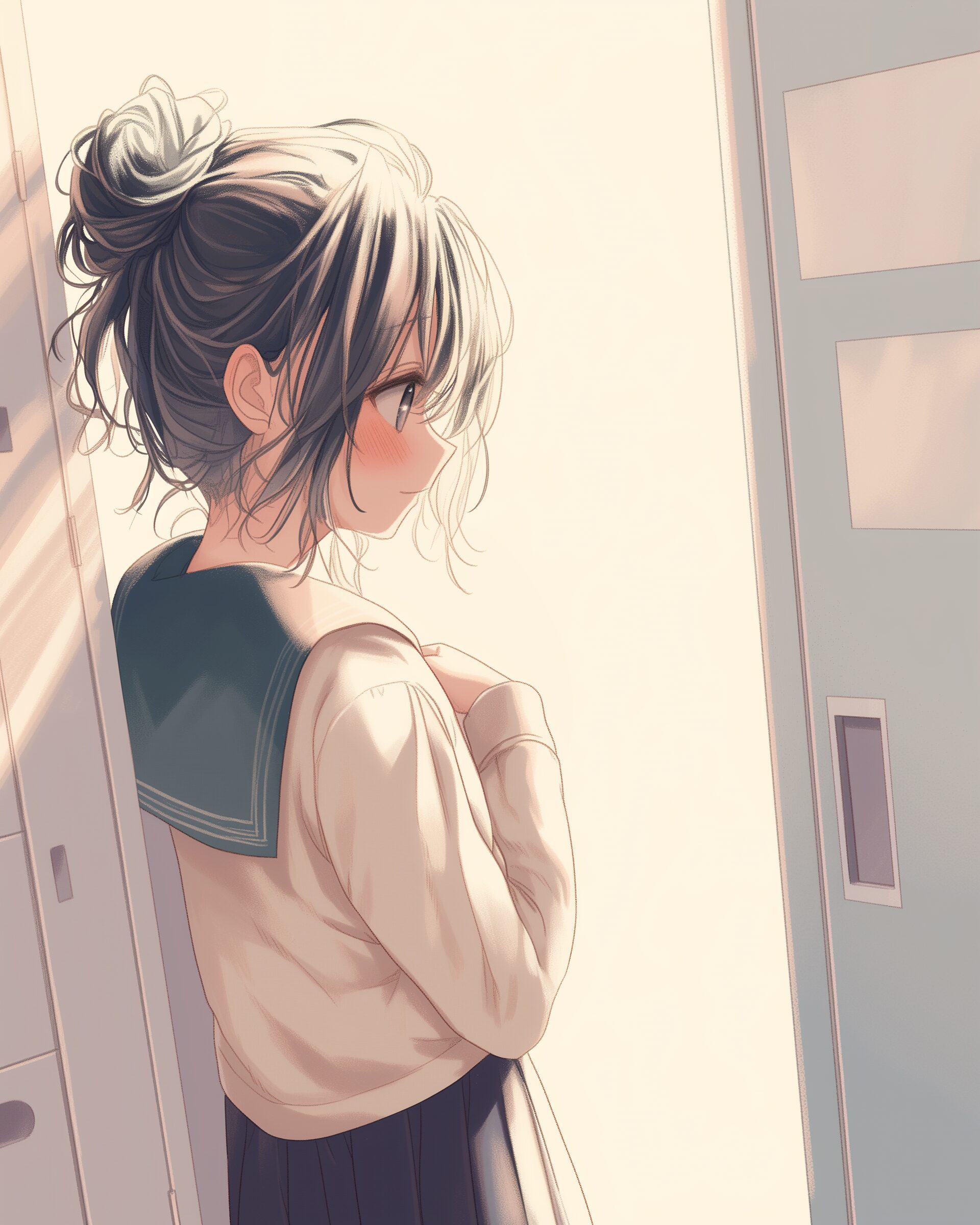 検索タグ:イラスト、キャラクター、女性、女、女の子、女子、女の人、アニメ、漫画、マンガ、美人、美女、若い、かわいい、可愛い、カワイイ、人物、顔、美しい、綺麗、きれい、キレイ、アート、お洒落、挿絵、インスタ、Instagram、AI生成画像、コピースペース、恋愛、恋、片思い、失恋、お団子ヘア、髪型、笑顔、微笑む、微笑み、後ろ姿