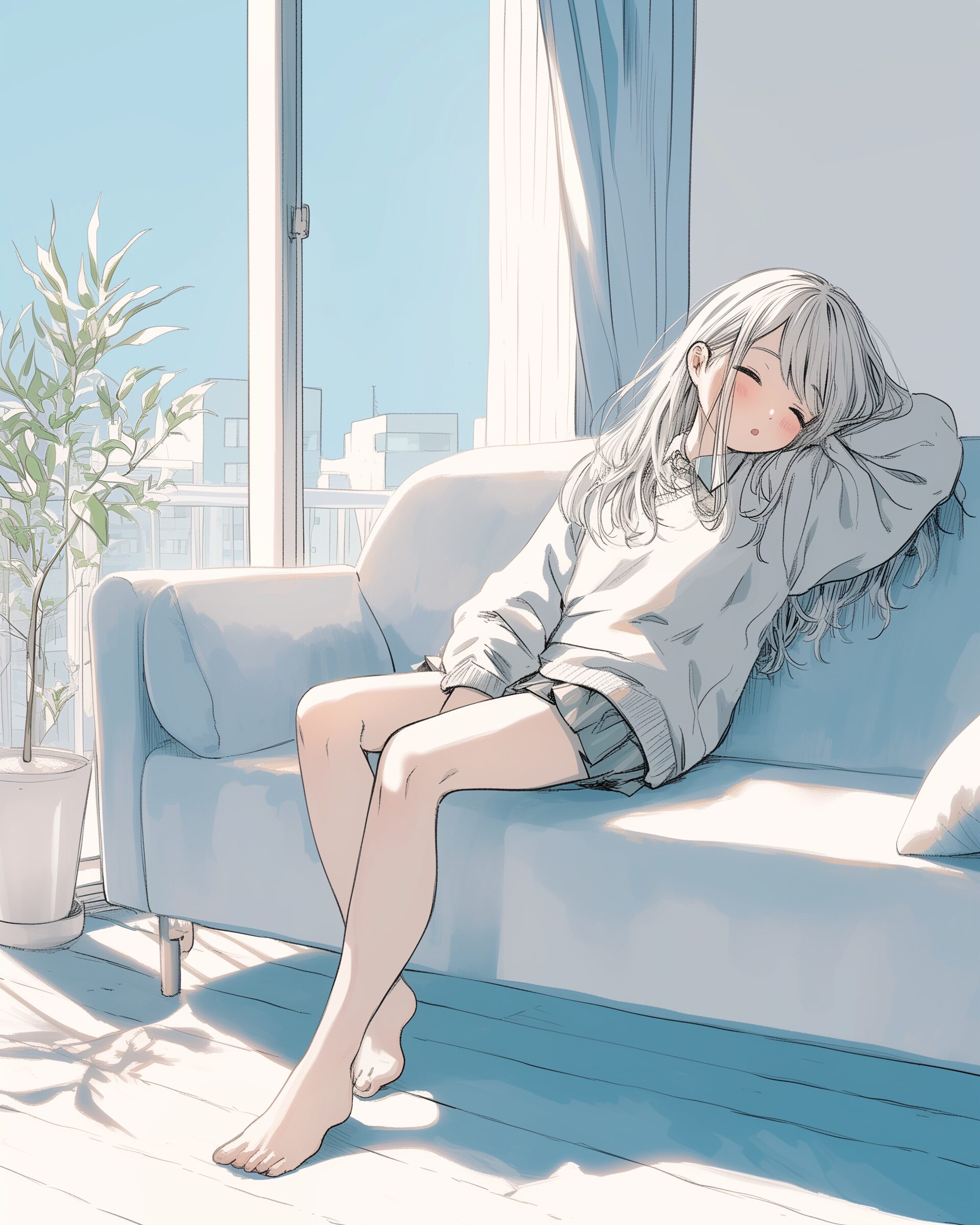 検索タグ:イラスト、ファッション、キャラクター、女性、女、女の子、女子、女の人、アニメ、漫画、マンガ、美人、美女、若い、かわいい、可愛い、カワイイ、人物、顔、美しい、綺麗、きれい、キレイ、アート、お洒落、挿絵、インスタ、Instagram、AI生成画像、fashion、コピースペース、銀髪、ソファ、お昼寝、寝る、眠る、睡眠、ぐっすり