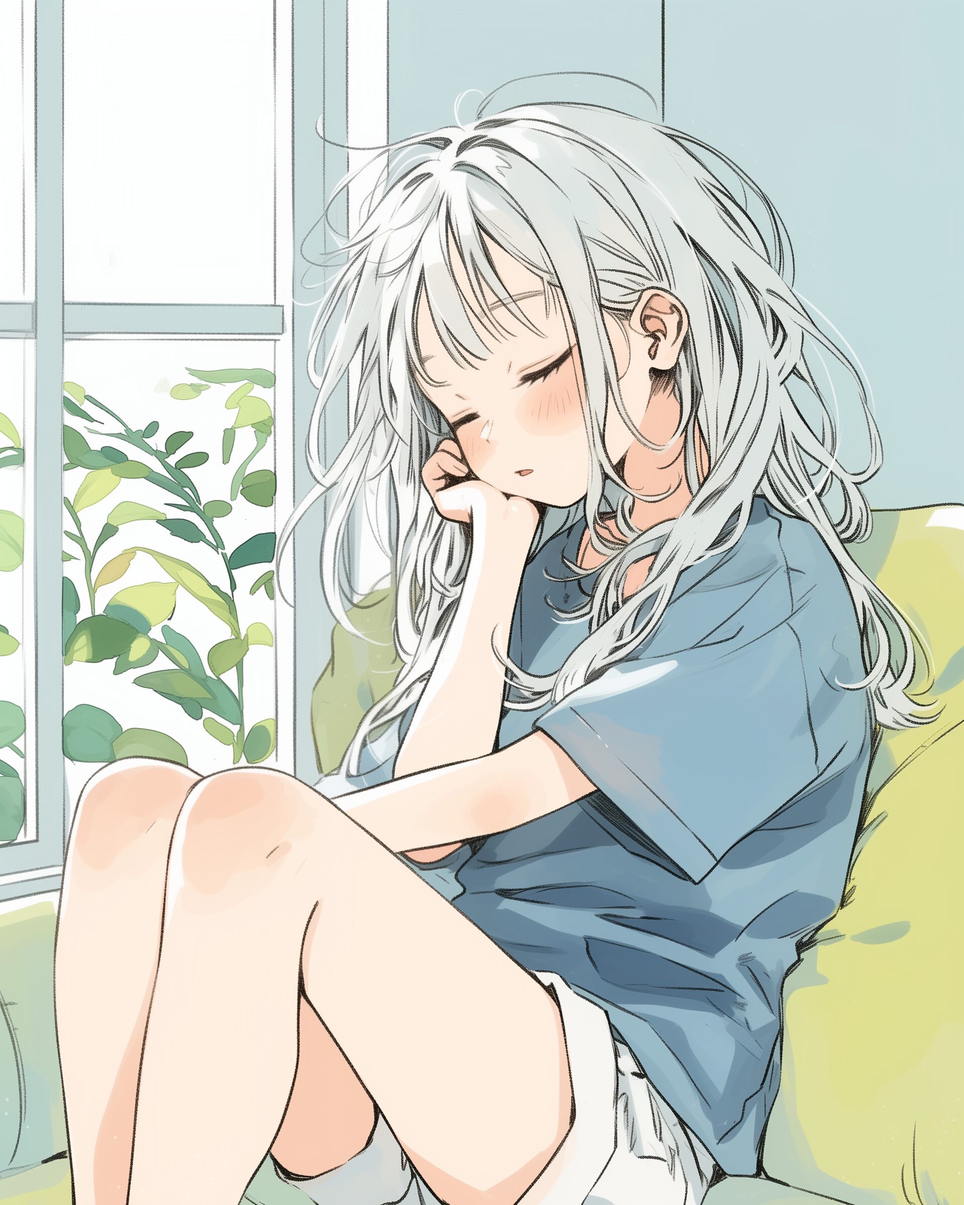 検索タグ:イラスト、ファッション、キャラクター、女性、女、女の子、女子、女の人、アニメ、漫画、マンガ、美人、美女、若い、かわいい、可愛い、カワイイ、人物、顔、美しい、綺麗、きれい、キレイ、アート、お洒落、挿絵、インスタ、Instagram、AI生成画像、fashion、コピースペース、銀髪、ソファ、お昼寝、寝る、眠る、睡眠、ぐっすり