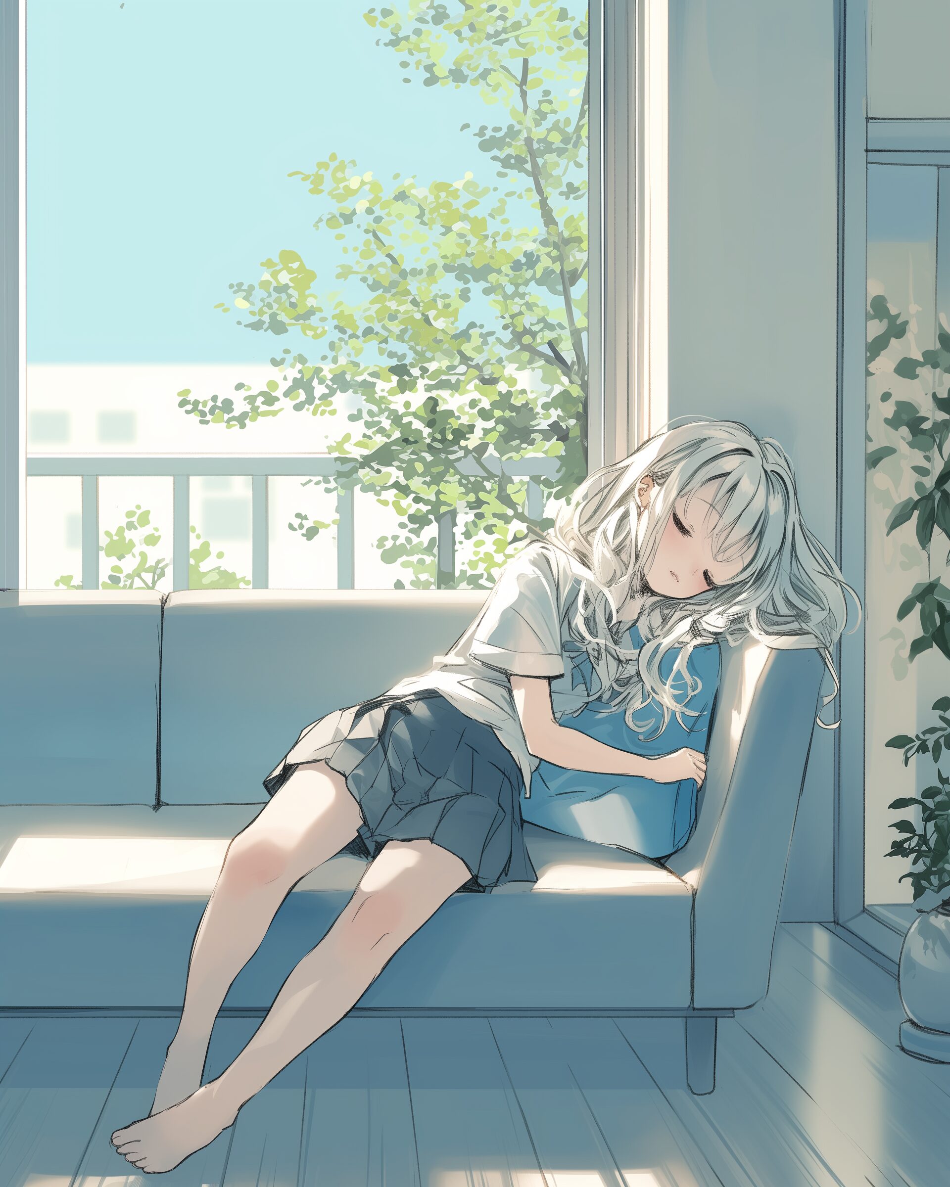 検索タグ:イラスト、ファッション、キャラクター、女性、女、女の子、女子、女の人、アニメ、漫画、マンガ、美人、美女、若い、かわいい、可愛い、カワイイ、人物、顔、美しい、綺麗、きれい、キレイ、アート、お洒落、挿絵、インスタ、Instagram、AI生成画像、fashion、コピースペース、銀髪、ソファ、お昼寝、寝る、眠る、睡眠、ぐっすり