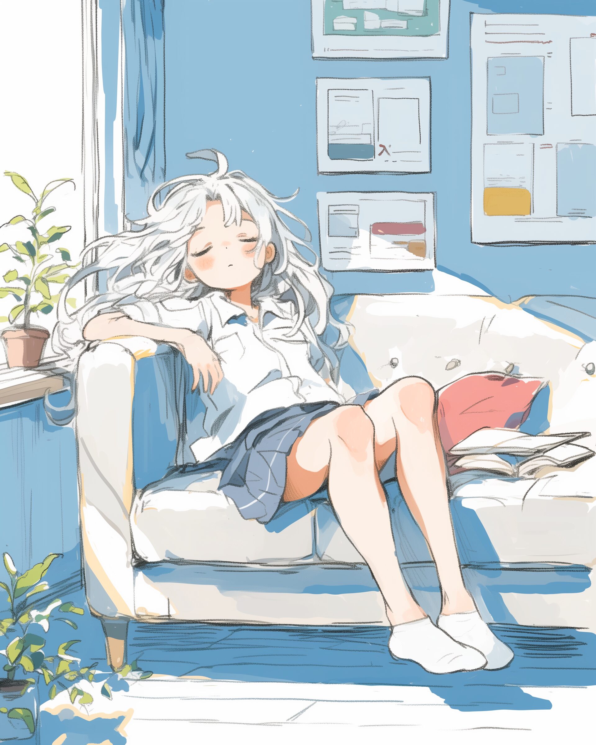 検索タグ:イラスト、ファッション、キャラクター、女性、女、女の子、女子、女の人、アニメ、漫画、マンガ、美人、美女、若い、かわいい、可愛い、カワイイ、人物、顔、美しい、綺麗、きれい、キレイ、アート、お洒落、挿絵、インスタ、Instagram、AI生成画像、fashion、コピースペース、銀髪、ソファ、お昼寝、寝る、眠る、睡眠、ぐっすり