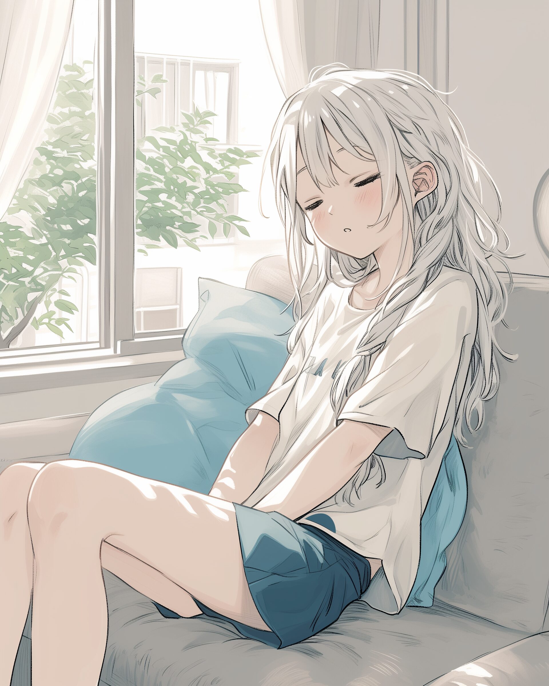検索タグ:イラスト、ファッション、キャラクター、女性、女、女の子、女子、女の人、アニメ、漫画、マンガ、美人、美女、若い、かわいい、可愛い、カワイイ、人物、顔、美しい、綺麗、きれい、キレイ、アート、お洒落、挿絵、インスタ、Instagram、AI生成画像、fashion、コピースペース、銀髪、ソファ、お昼寝、寝る、眠る、睡眠、ぐっすり
