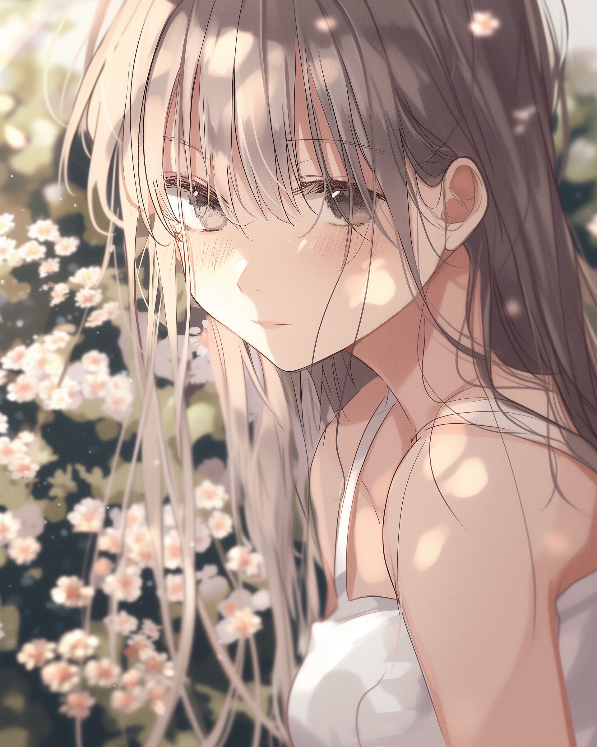 検索タグ:イラスト、ファッション、キャラクター、女性、女、女の子、女子、女の人、アニメ、漫画、マンガ、美人、美女、若い、かわいい、可愛い、カワイイ、人物、顔、美しい、綺麗、きれい、キレイ、アート、お洒落、挿絵、インスタ、Instagram、AI生成画像、fashion、コピースペース、学生、高校生、無表情、ロングヘア、長い髪、銀髪、シルバーヘア、お花畑、花
