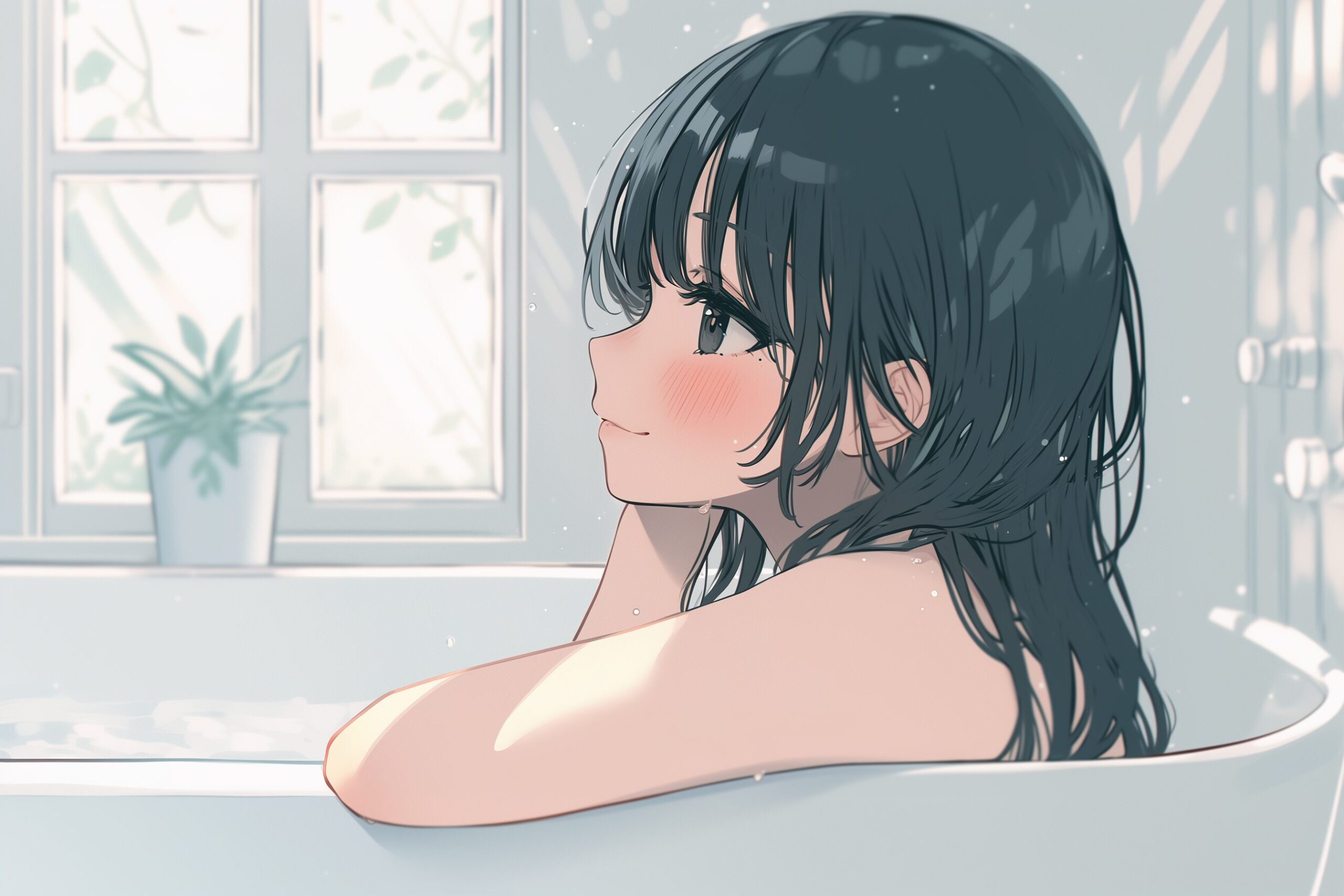 検索タグ:イラスト、ファッション、キャラクター、女性、女、女の子、女子、女の人、アニメ、漫画、マンガ、美人、美女、若い、かわいい、可愛い、カワイイ、人物、顔、美しい、綺麗、きれい、キレイ、アート、お洒落、挿絵、インスタ、Instagram、AI生成画像、fashion、コピースペース、黒髪、JK、女子高生、学生、橘柚、たちばな、ゆず、お風呂、銭湯