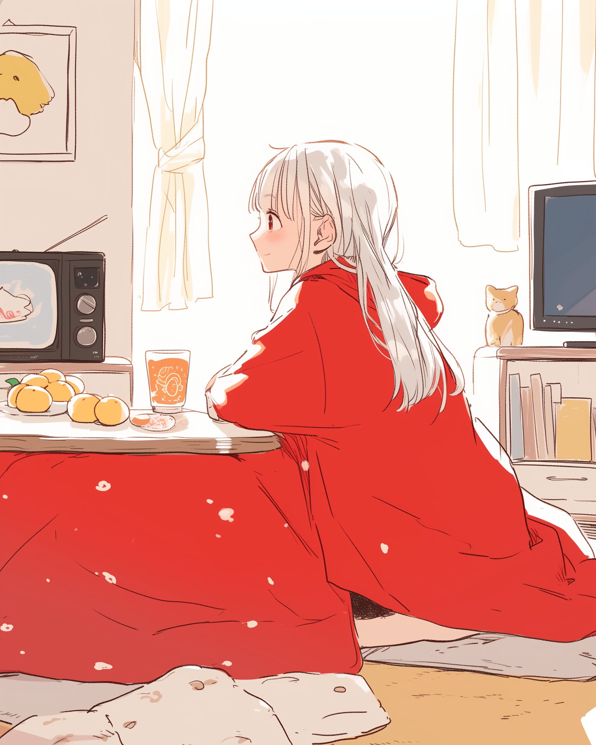 検索タグ:イラスト、ファッション、キャラクター、女性、女、女の子、女子、女の人、アニメ、漫画、マンガ、美人、美女、若い、かわいい、可愛い、カワイイ、人物、顔、美しい、綺麗、きれい、キレイ、アート、お洒落、挿絵、インスタ、Instagram、AI生成画像、fashion、コピースペース、おしゃれ、オシャレ、冬、こたつ、コタツ、部屋、室内、笑顔、銀髪