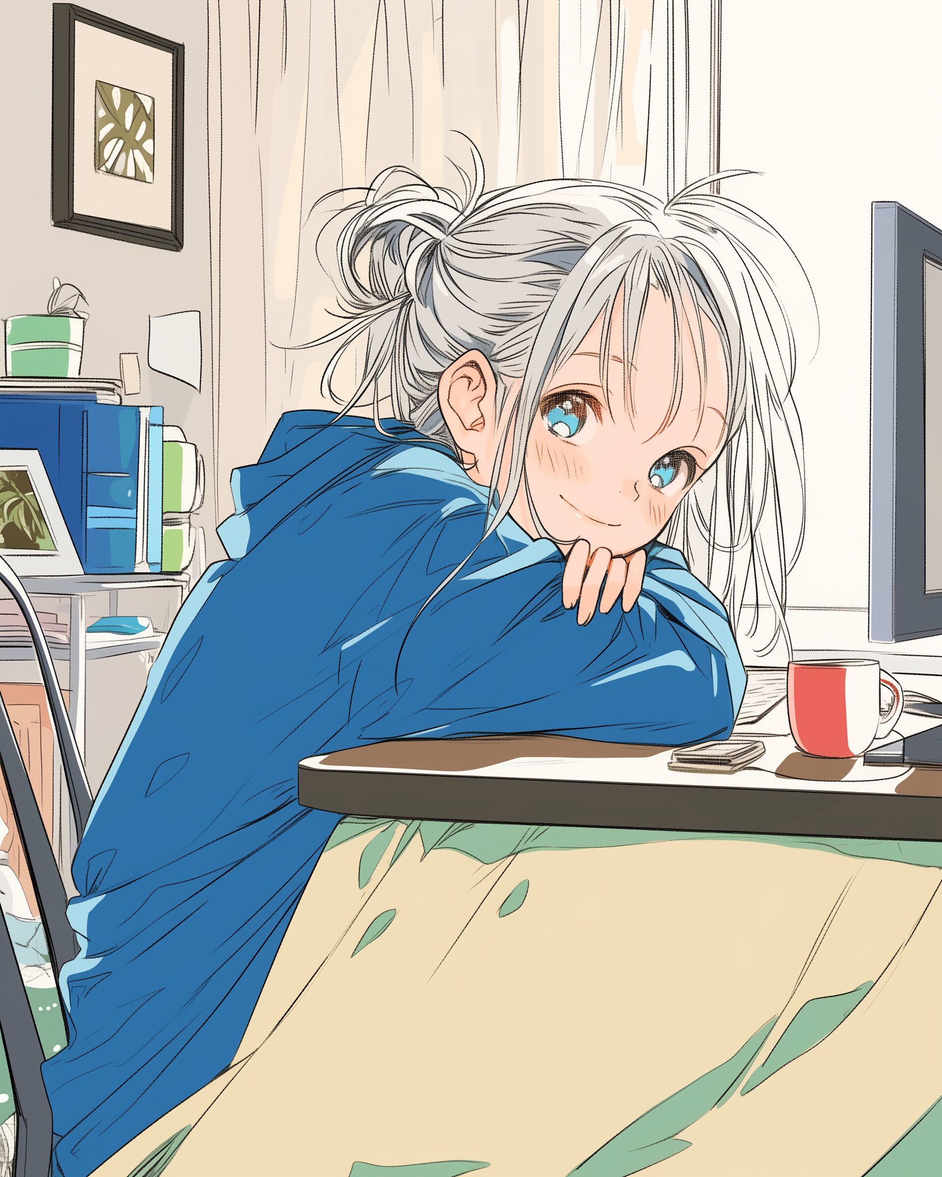 検索タグ:イラスト、ファッション、キャラクター、女性、女、女の子、女子、女の人、アニメ、漫画、マンガ、美人、美女、若い、かわいい、可愛い、カワイイ、人物、顔、美しい、綺麗、きれい、キレイ、アート、お洒落、挿絵、インスタ、Instagram、AI生成画像、fashion、コピースペース、おしゃれ、オシャレ、冬、こたつ、コタツ、部屋、室内、笑顔、銀髪