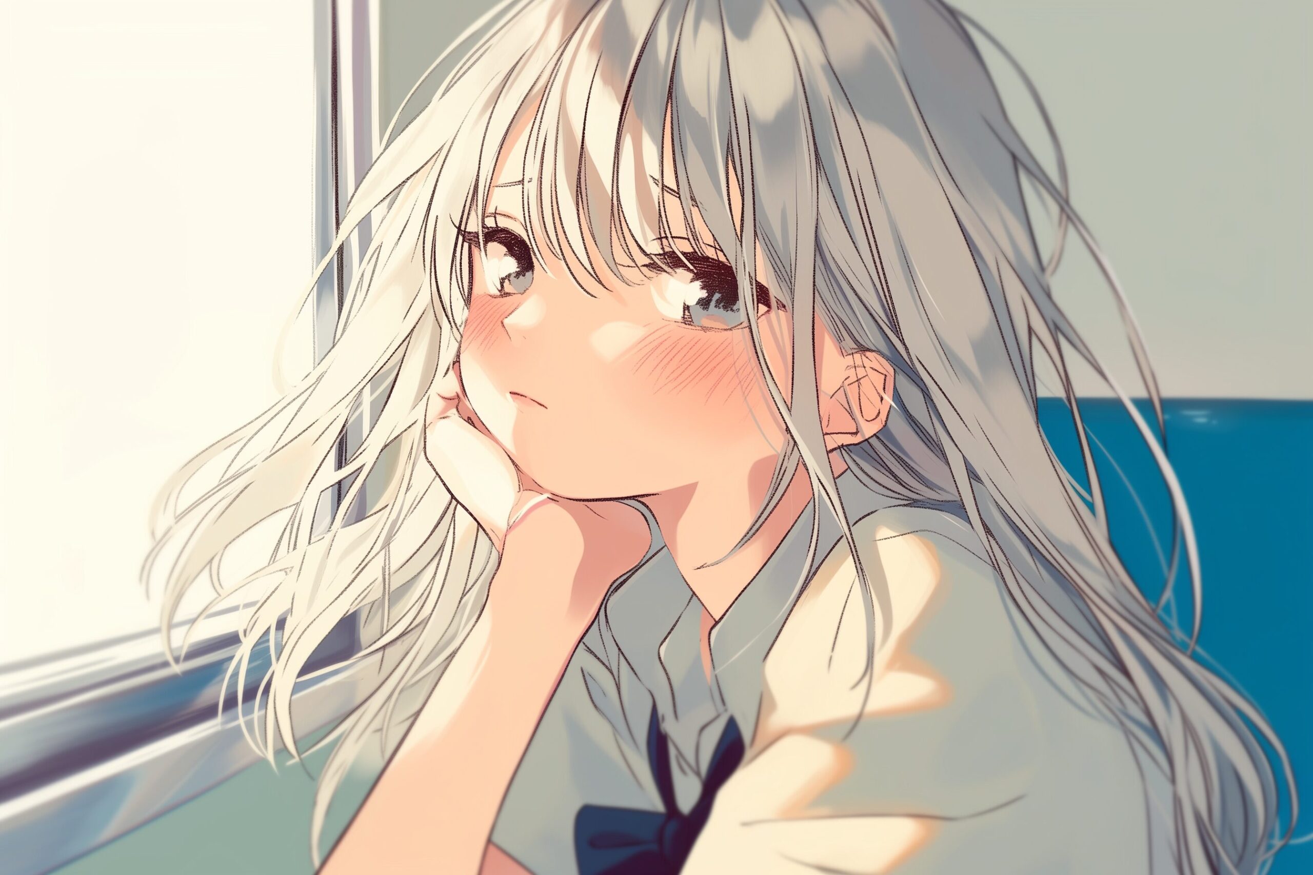 検索タグ:イラスト、キャラクター、女性、女、女の子、女子、女の人、アニメ、漫画、マンガ、美人、美女、若い、かわいい、可愛い、カワイイ、人物、顔、美しい、綺麗、きれい、キレイ、アート、お洒落、挿絵、インスタ、Instagram、AI生成画像、fashion、コピースペース、銀髪、バス車内、電車、出会い、恋、恋愛、通学中、帰宅途中