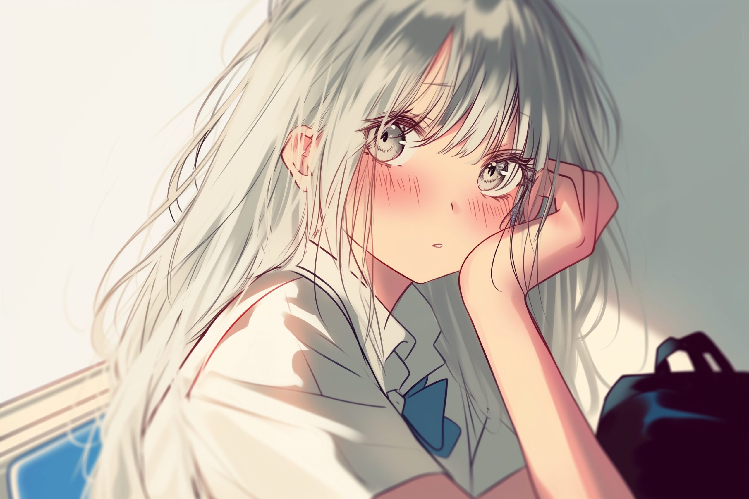 検索タグ:イラスト、キャラクター、女性、女、女の子、女子、女の人、アニメ、漫画、マンガ、美人、美女、若い、かわいい、可愛い、カワイイ、人物、顔、美しい、綺麗、きれい、キレイ、アート、お洒落、挿絵、インスタ、Instagram、AI生成画像、fashion、コピースペース、銀髪、バス車内、電車、出会い、恋、恋愛、通学中、帰宅途中