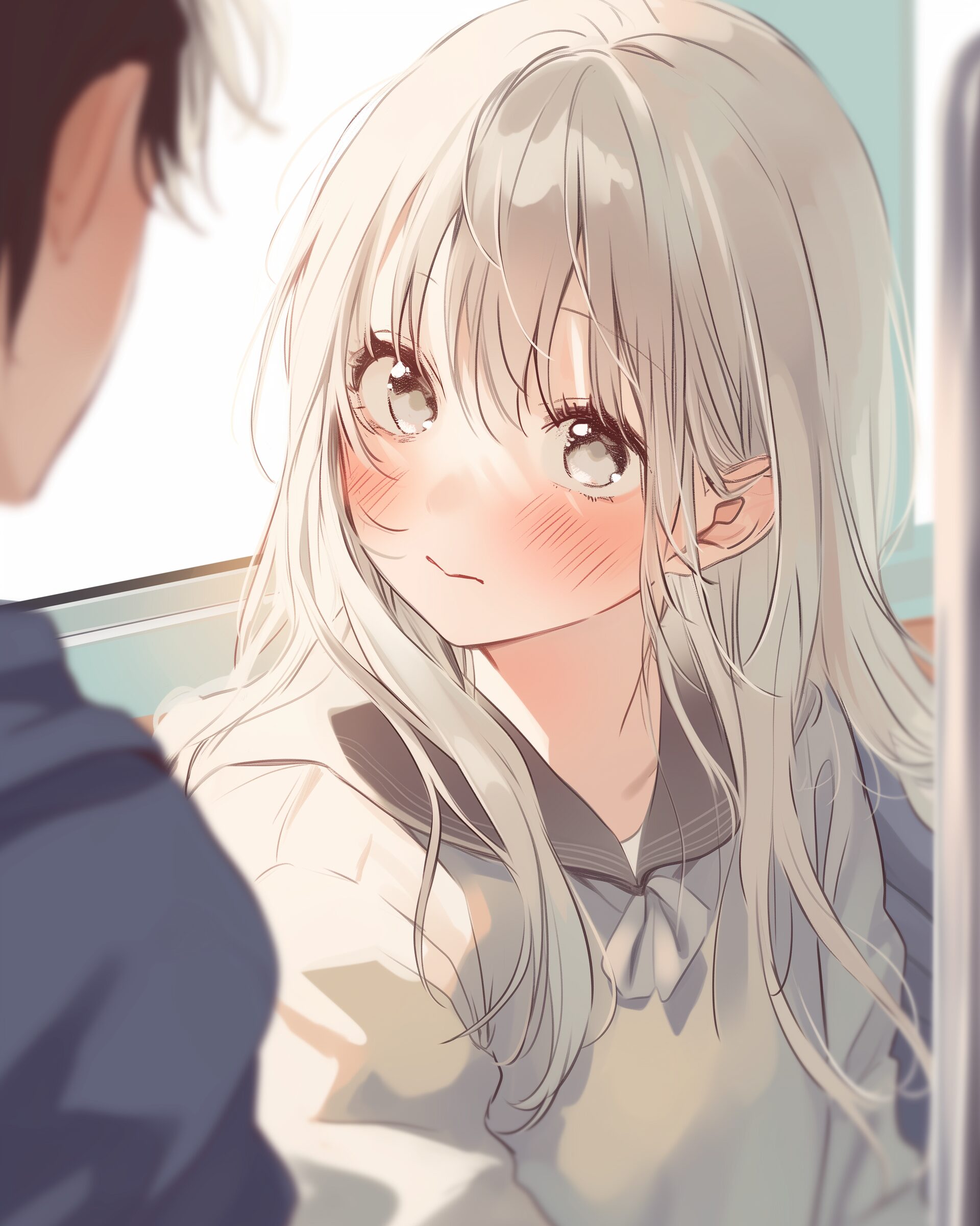 検索タグ:イラスト、キャラクター、女性、女、女の子、女子、女の人、アニメ、漫画、マンガ、美人、美女、若い、かわいい、可愛い、カワイイ、人物、顔、美しい、綺麗、きれい、キレイ、アート、お洒落、挿絵、インスタ、Instagram、AI生成画像、fashion、コピースペース、銀髪、バス車内、電車、出会い、恋、恋愛、通学中、帰宅途中