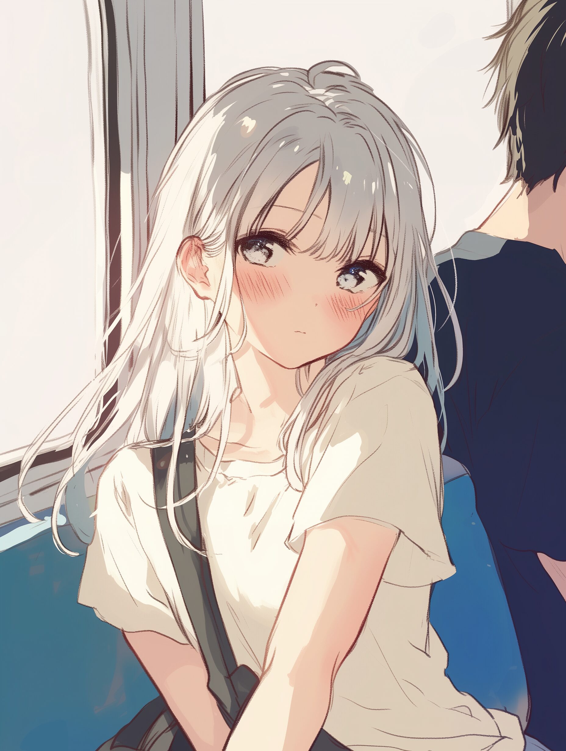 検索タグ:イラスト、キャラクター、女性、女、女の子、女子、女の人、アニメ、漫画、マンガ、美人、美女、若い、かわいい、可愛い、カワイイ、人物、顔、美しい、綺麗、きれい、キレイ、アート、お洒落、挿絵、インスタ、Instagram、AI生成画像、fashion、コピースペース、銀髪、バス車内、電車、出会い、恋、恋愛、通学中、帰宅途中