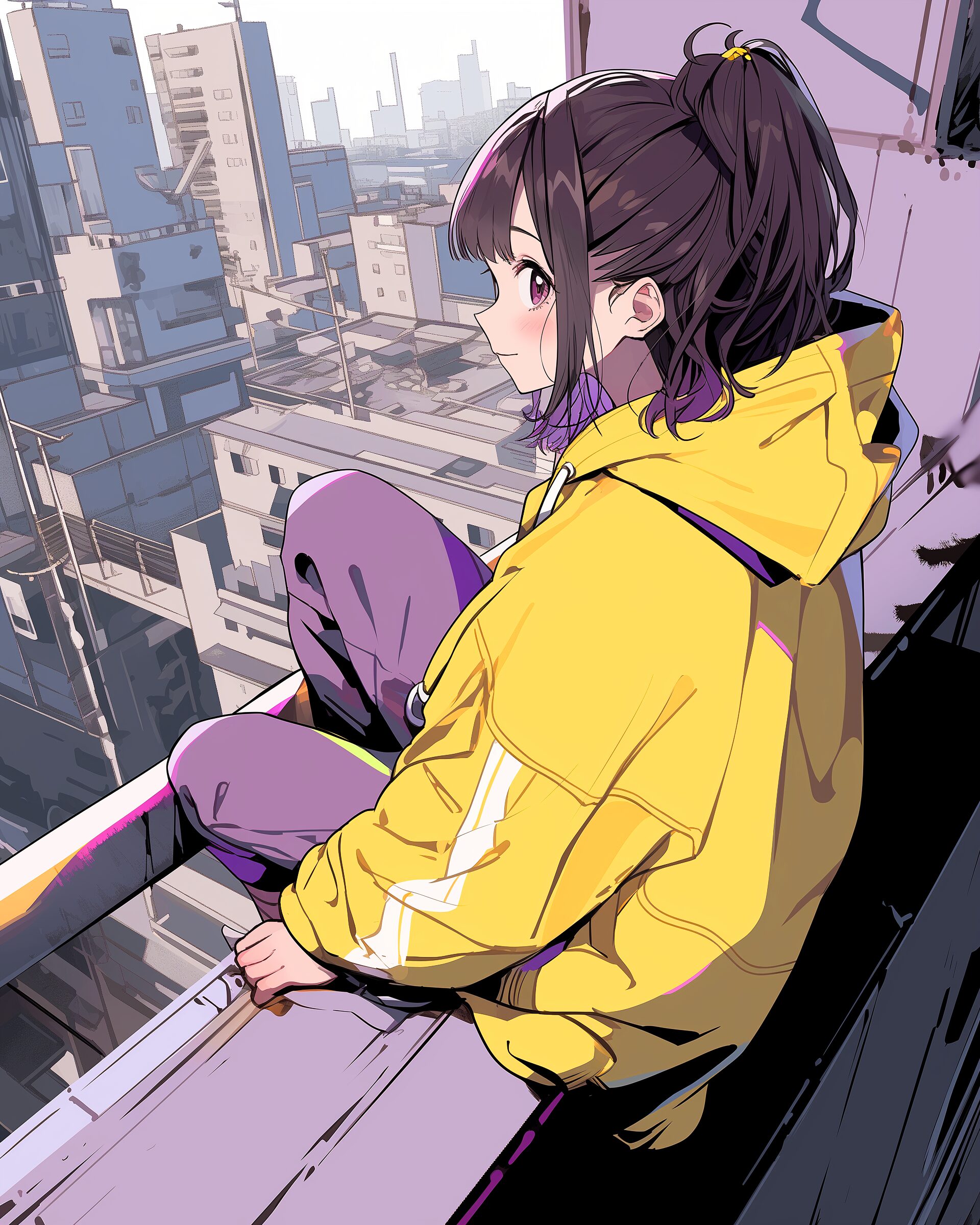 オシャレな屋上に座るイエローパープルファッションの女の子イラスト04