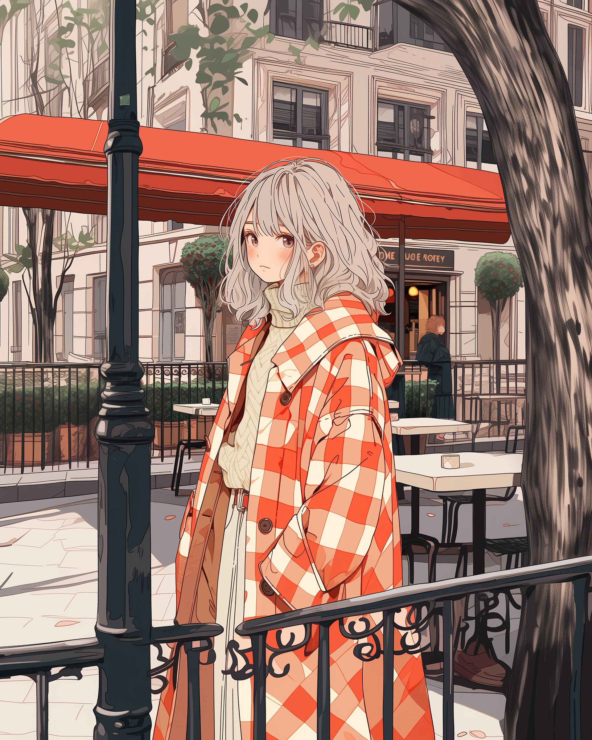 検索タグ:イラスト、ファッション、キャラクター、女性、女、女の子、女子、女の人、アニメ、漫画、マンガ、美人、美女、若い、かわいい、可愛い、カワイイ、人物、顔、美しい、綺麗、きれい、キレイ、アート、お洒落、挿絵、インスタ、Instagram、AI生成画像、fashion、コピースペース、おしゃれ、オシャレ、秋、秋服、冬服、コート、チェック柄