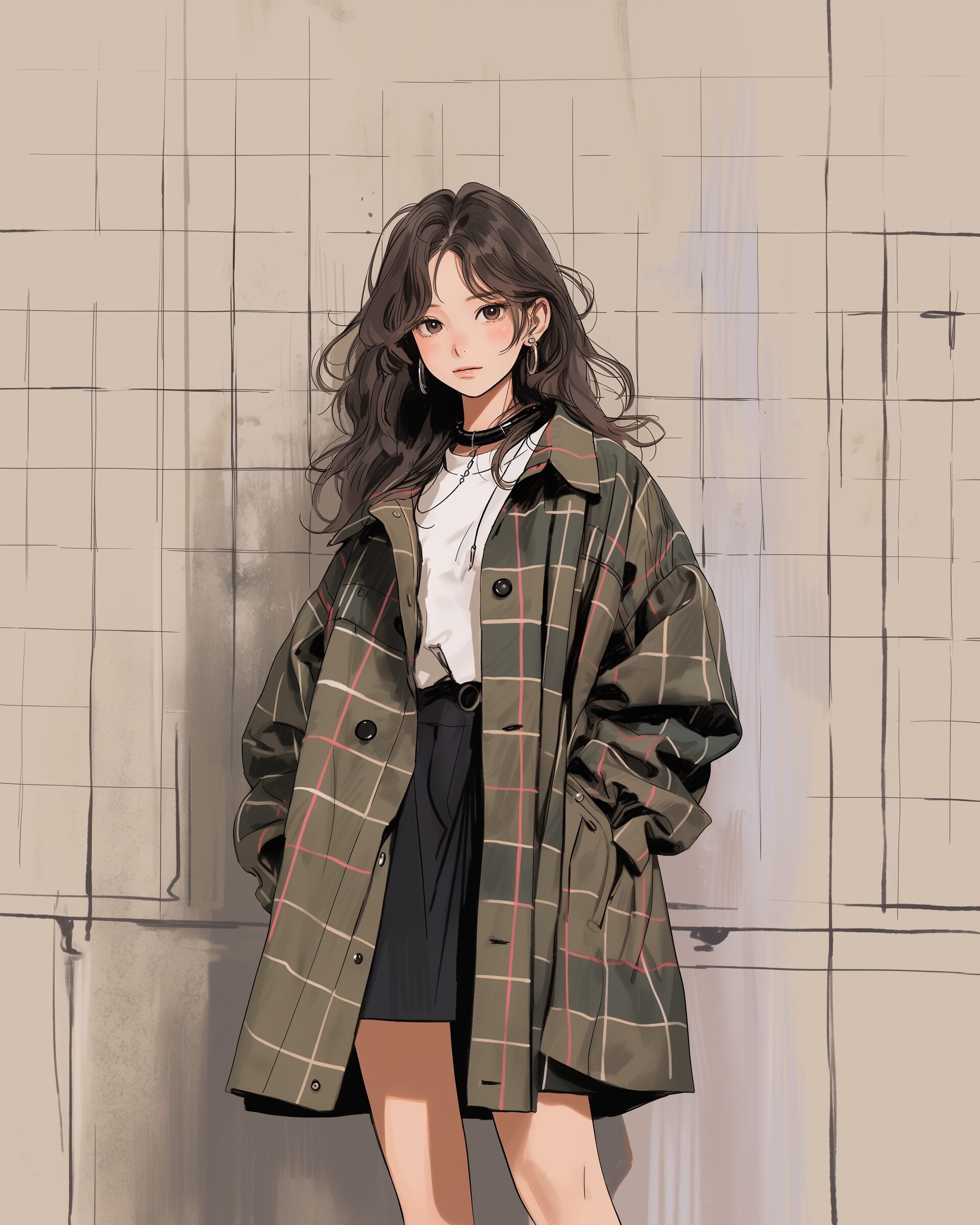 検索タグ:イラスト、ファッション、キャラクター、女性、女、女の子、女子、女の人、アニメ、漫画、マンガ、美人、美女、若い、かわいい、可愛い、カワイイ、人物、顔、美しい、綺麗、きれい、キレイ、アート、お洒落、挿絵、インスタ、Instagram、AI生成画像、fashion、コピースペース、おしゃれ、オシャレ、秋、秋服、冬服、コート、チェック柄