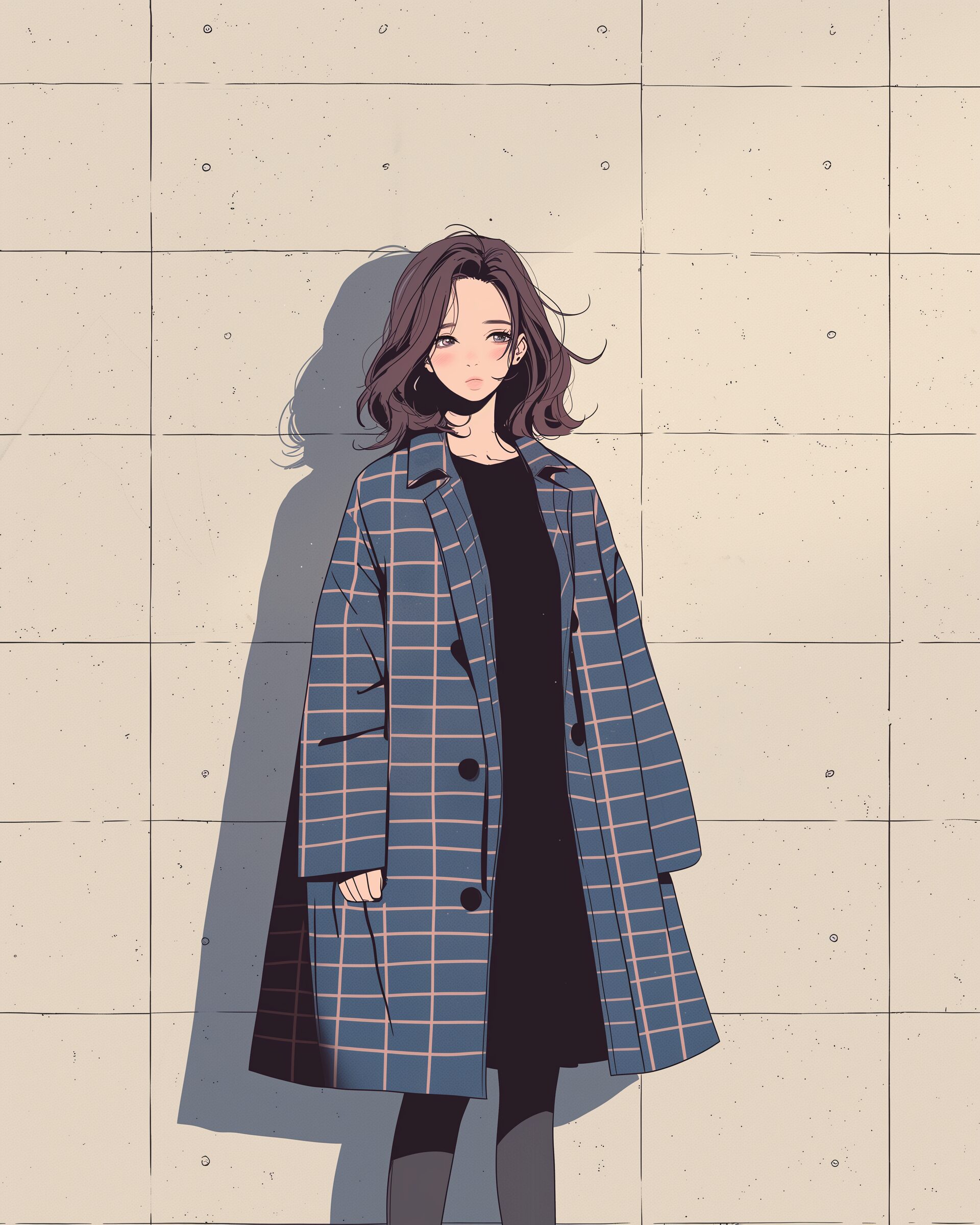 検索タグ:イラスト、ファッション、キャラクター、女性、女、女の子、女子、女の人、アニメ、漫画、マンガ、美人、美女、若い、かわいい、可愛い、カワイイ、人物、顔、美しい、綺麗、きれい、キレイ、アート、お洒落、挿絵、インスタ、Instagram、AI生成画像、fashion、コピースペース、おしゃれ、オシャレ、秋、秋服、冬服、コート、チェック柄