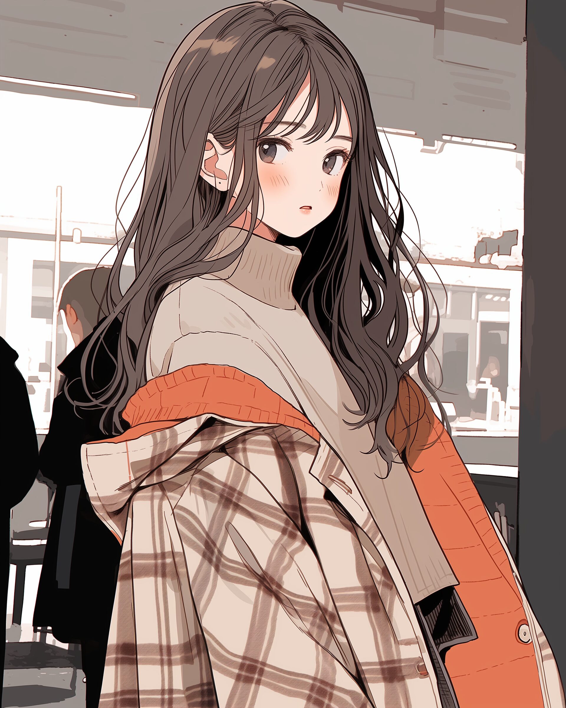 検索タグ:イラスト、ファッション、キャラクター、女性、女、女の子、女子、女の人、アニメ、漫画、マンガ、美人、美女、若い、かわいい、可愛い、カワイイ、人物、顔、美しい、綺麗、きれい、キレイ、アート、お洒落、挿絵、インスタ、Instagram、AI生成画像、fashion、コピースペース、おしゃれ、オシャレ、秋、秋服、冬服、コート、チェック柄