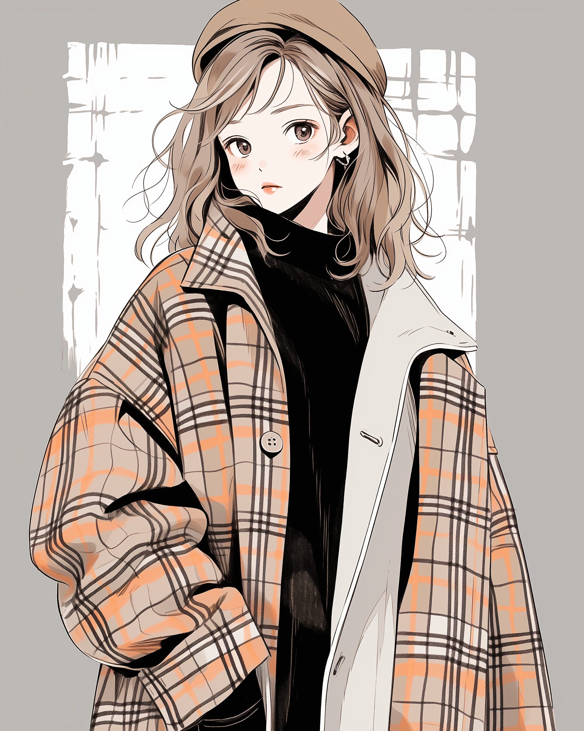 検索タグ:イラスト、ファッション、キャラクター、女性、女、女の子、女子、女の人、アニメ、漫画、マンガ、美人、美女、若い、かわいい、可愛い、カワイイ、人物、顔、美しい、綺麗、きれい、キレイ、アート、お洒落、挿絵、インスタ、Instagram、AI生成画像、fashion、コピースペース、おしゃれ、オシャレ、秋、秋服、冬服、コート、チェック柄