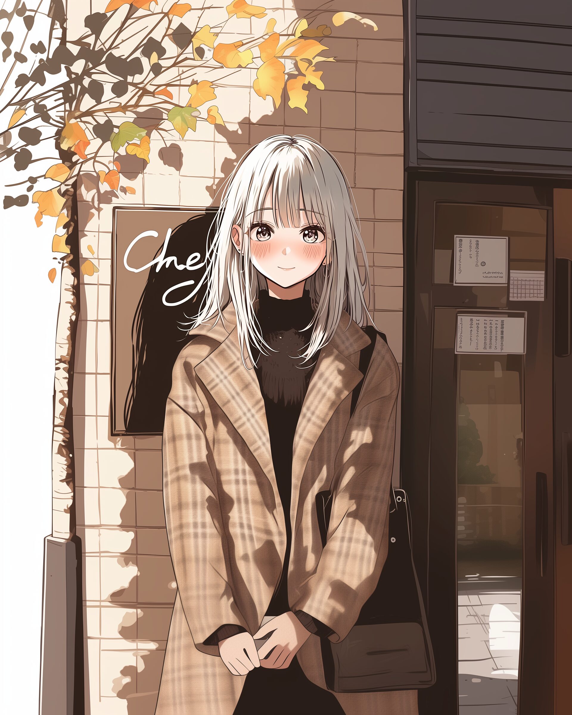 検索タグ:イラスト、キャラクター、女性、女、女の子、女子、女の人、アニメ、漫画、マンガ、美人、美女、若い、かわいい、可愛い、カワイイ、人物、顔、美しい、綺麗、きれい、キレイ、アート、お洒落、挿絵、インスタ、Instagram、AI生成画像、fashion、コピースペース、銀髪、お出かけ、街中、コート、オシャレ、おしゃれ、コーディネート、ファッション、カフェ前、待ち合わせ