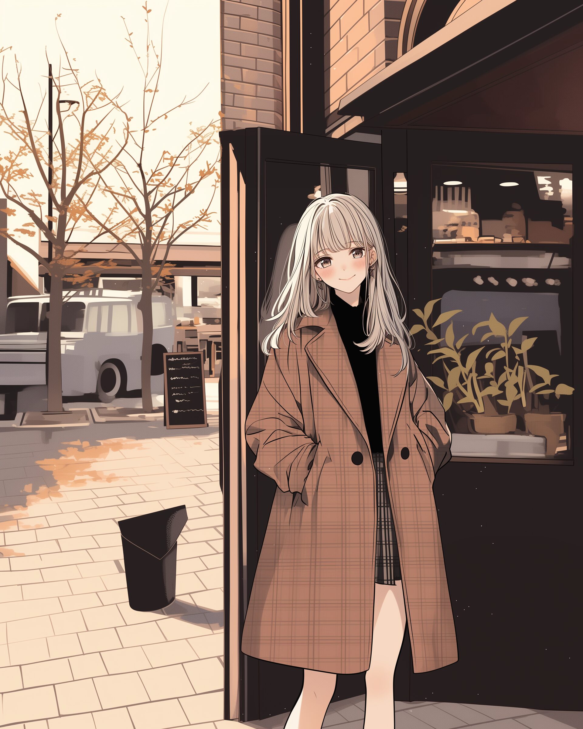 検索タグ:イラスト、キャラクター、女性、女、女の子、女子、女の人、アニメ、漫画、マンガ、美人、美女、若い、かわいい、可愛い、カワイイ、人物、顔、美しい、綺麗、きれい、キレイ、アート、お洒落、挿絵、インスタ、Instagram、AI生成画像、fashion、コピースペース、銀髪、お出かけ、街中、コート、オシャレ、おしゃれ、コーディネート、ファッション、カフェ前、待ち合わせ