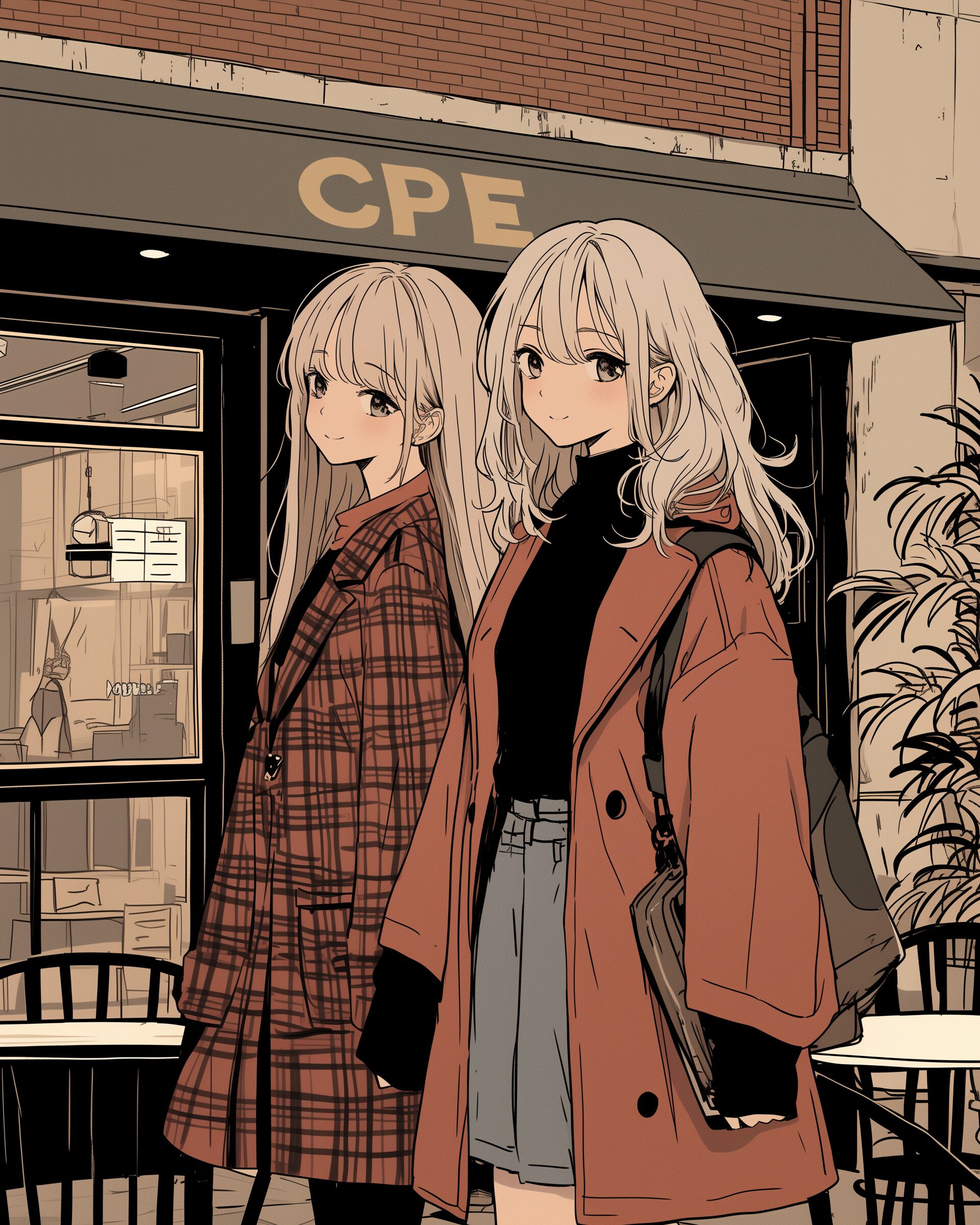 検索タグ:イラスト、キャラクター、女性、女、女の子、女子、女の人、アニメ、漫画、マンガ、美人、美女、若い、かわいい、可愛い、カワイイ、人物、顔、美しい、綺麗、きれい、キレイ、アート、お洒落、挿絵、インスタ、Instagram、AI生成画像、fashion、コピースペース、銀髪、お出かけ、街中、コート、オシャレ、おしゃれ、コーディネート、ファッション、カフェ前、待ち合わせ、2人、仲良し、友達
