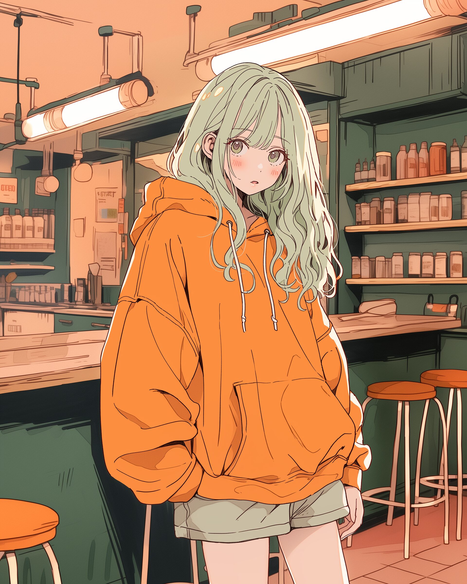 検索タグ:イラスト、ファッション、キャラクター、女性、女、女の子、女子、女の人、アニメ、漫画、マンガ、美人、美女、若い、かわいい、可愛い、カワイイ、人物、顔、美しい、綺麗、きれい、キレイ、アート、お洒落、女子高生、JK、挿絵、夏、春、パステルカラー、トップス、春服、hoodie、パーカー、パーカー女子、待ち受け画像、春服、オレンジ、緑、グリーン、Green、orange