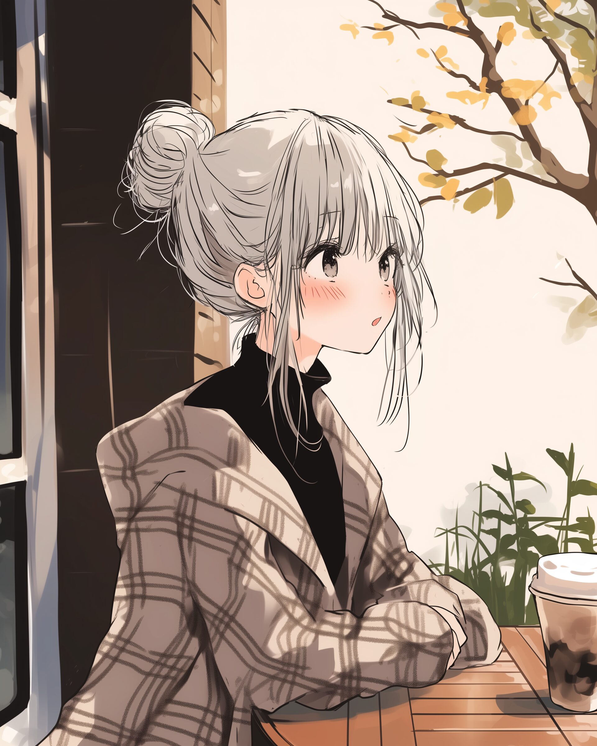 検索タグ:イラスト、ファッション、キャラクター、女性、女、女の子、女子、女の人、アニメ、漫画、マンガ、美人、美女、若い、かわいい、可愛い、カワイイ、人物、顔、美しい、綺麗、きれい、キレイ、アート、お洒落、挿絵、インスタ、Instagram、AI生成画像、fashion、コピースペース、銀髪、カフェ、待ち合わせ、冬服、コート、デート