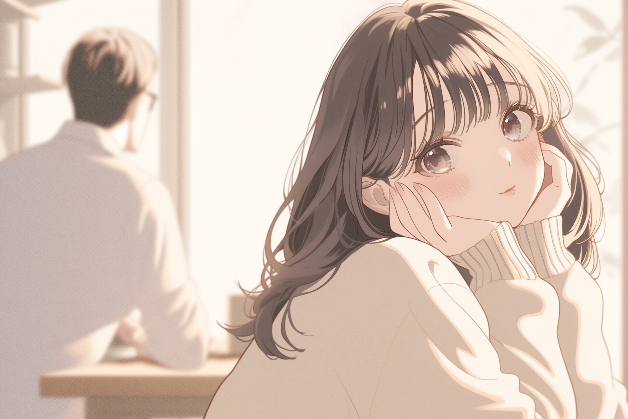 検索タグ:イラスト、ファッション、キャラクター、女性、女、女の子、女子、女の人、アニメ、漫画、マンガ、美人、美女、若い、かわいい、可愛い、カワイイ、人物、顔、美しい、綺麗、きれい、キレイ、アート、お洒落、挿絵、インスタ、Instagram、AI生成画像、fashion、コピースペース、カフェ、待ち合わせ、横顔、黒髪、デートの魔法、白セーター、白ニット