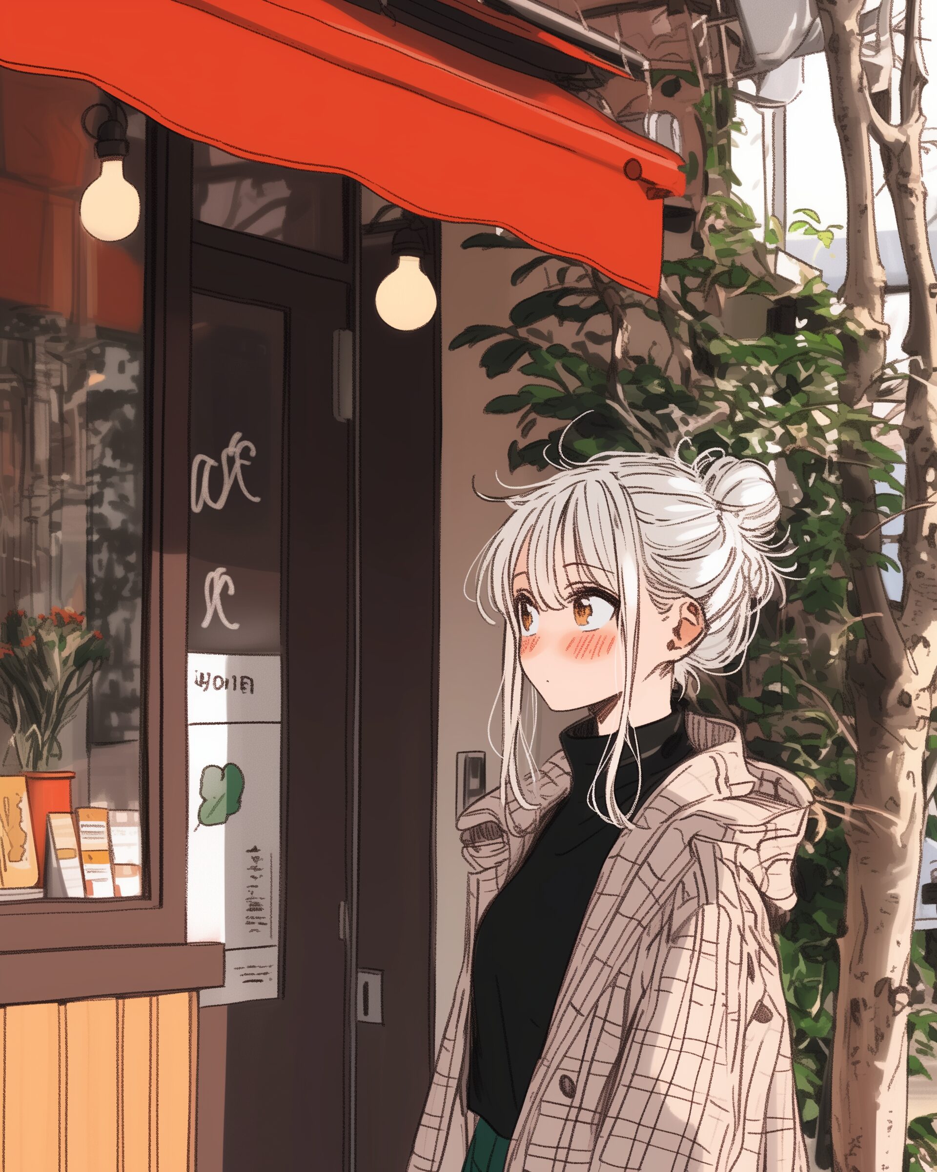 検索タグ:イラスト、ファッション、キャラクター、女性、女、女の子、女子、女の人、アニメ、漫画、マンガ、美人、美女、若い、かわいい、可愛い、カワイイ、人物、顔、美しい、綺麗、きれい、キレイ、アート、お洒落、挿絵、インスタ、Instagram、AI生成画像、fashion、コピースペース、銀髪、カフェ、待ち合わせ、冬服、コート、デート