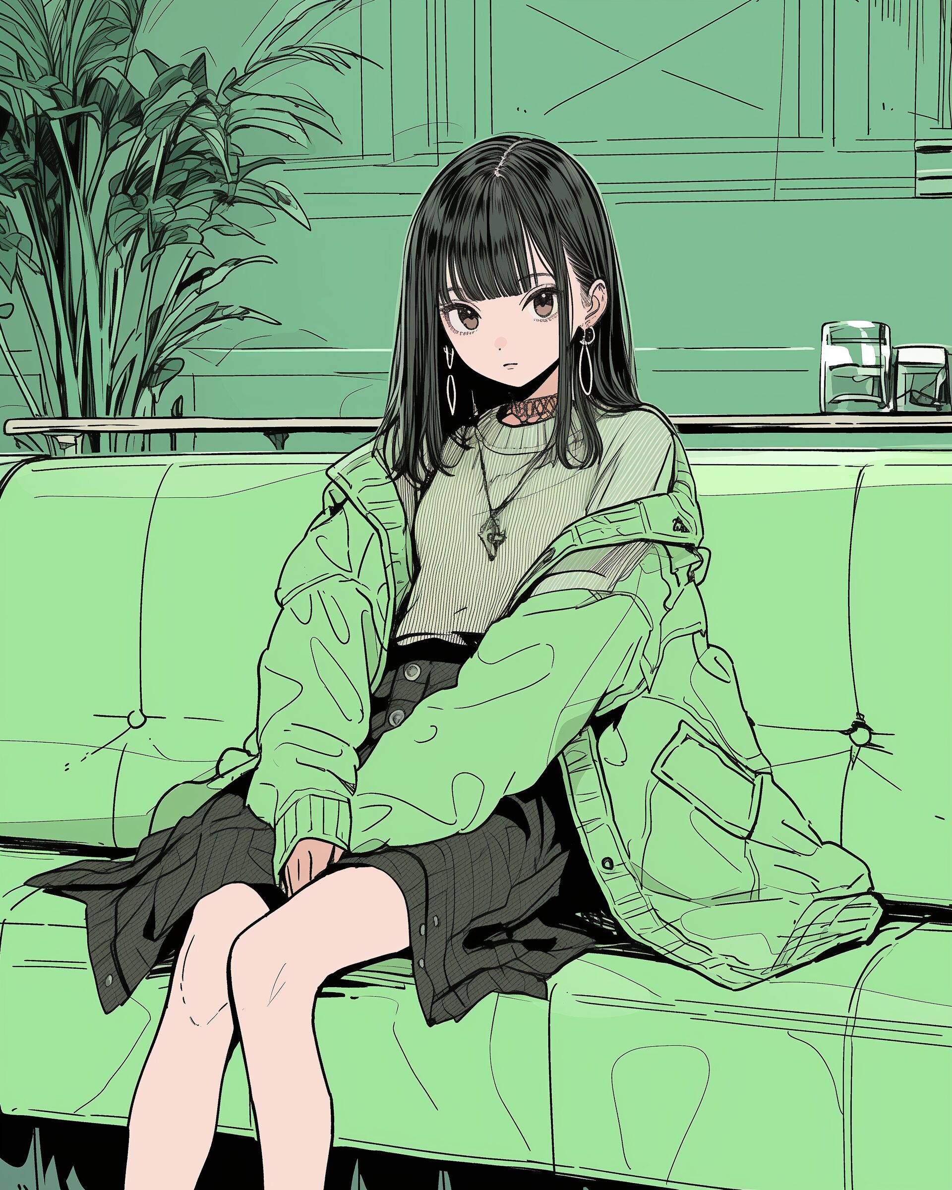 検索タグ:イラスト、ファッション、キャラクター、女性、女、女の子、女子、女の人、アニメ、漫画、マンガ、美人、美女、若い、かわいい、可愛い、カワイイ、人物、顔、美しい、綺麗、きれい、キレイ、アート、お洒落、女子高生、JK、挿絵、夏、春、パステルカラー、トップス、春服、インスタ、Instagram、緑、グリーン、Green