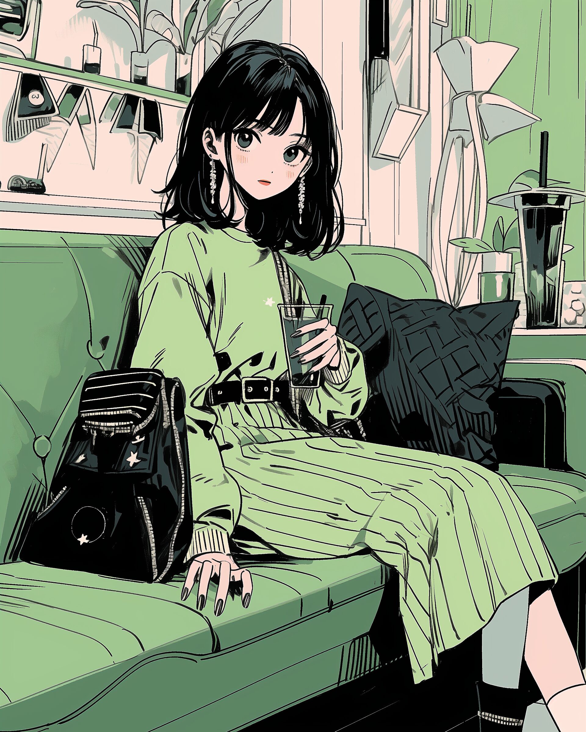 検索タグ:イラスト、ファッション、キャラクター、女性、女、女の子、女子、女の人、アニメ、漫画、マンガ、美人、美女、若い、かわいい、可愛い、カワイイ、人物、顔、美しい、綺麗、きれい、キレイ、アート、お洒落、女子高生、JK、挿絵、夏、春、パステルカラー、トップス、春服、インスタ、Instagram、緑、グリーン、Green
