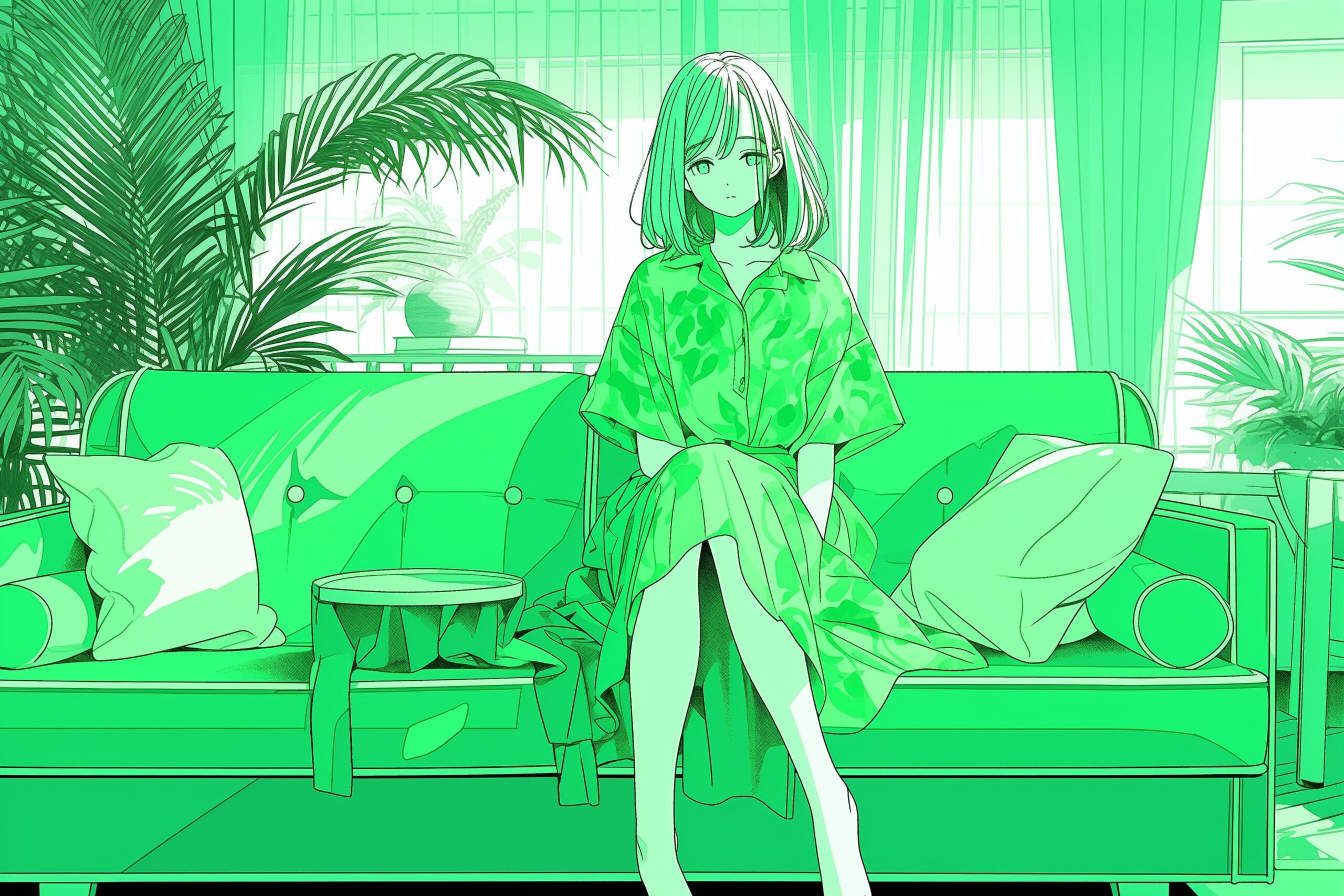検索タグ:イラスト、ファッション、キャラクター、女性、女、女の子、女子、女の人、アニメ、漫画、マンガ、美人、美女、若い、かわいい、可愛い、カワイイ、人物、顔、美しい、綺麗、きれい、キレイ、アート、お洒落、女子高生、JK、挿絵、夏、春、パステルカラー、トップス、春服、hoodie、パーカー、パーカー女子、待ち受け画像、春服、緑、ソファ、グリーン、Green