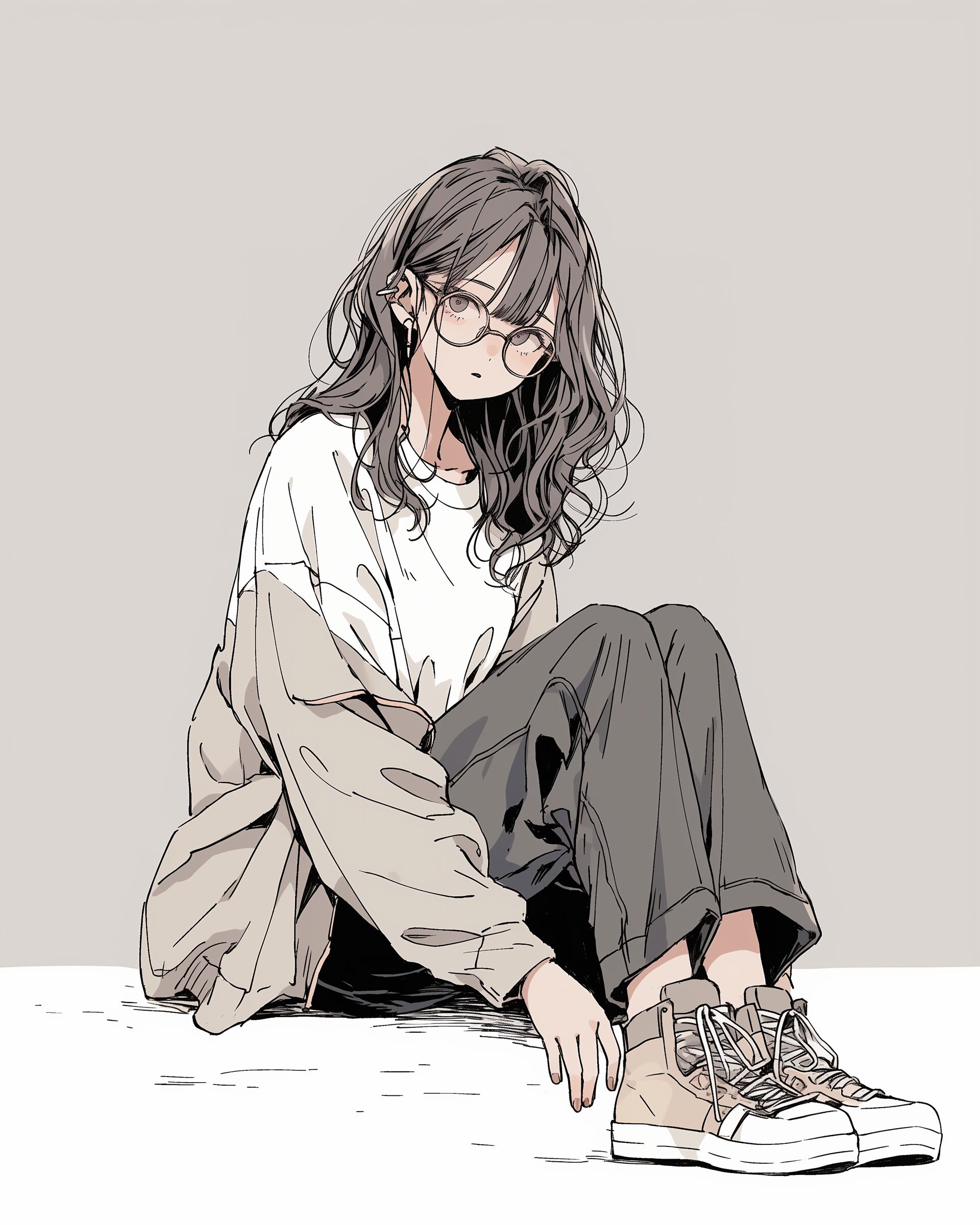 検索タグ:イラスト、ファッション、キャラクター、女性、女、女の子、女子、女の人、アニメ、漫画、マンガ、美人、美女、若い、かわいい、可愛い、カワイイ、人物、顔、美しい、綺麗、きれい、キレイ、アート、お洒落、女子高生、JK、挿絵、夏、春、パステルカラー、春服、インスタ、Instagram、ベージュ、beige、グレー、 grey。座る、座っている、めがね、メガネ、眼鏡