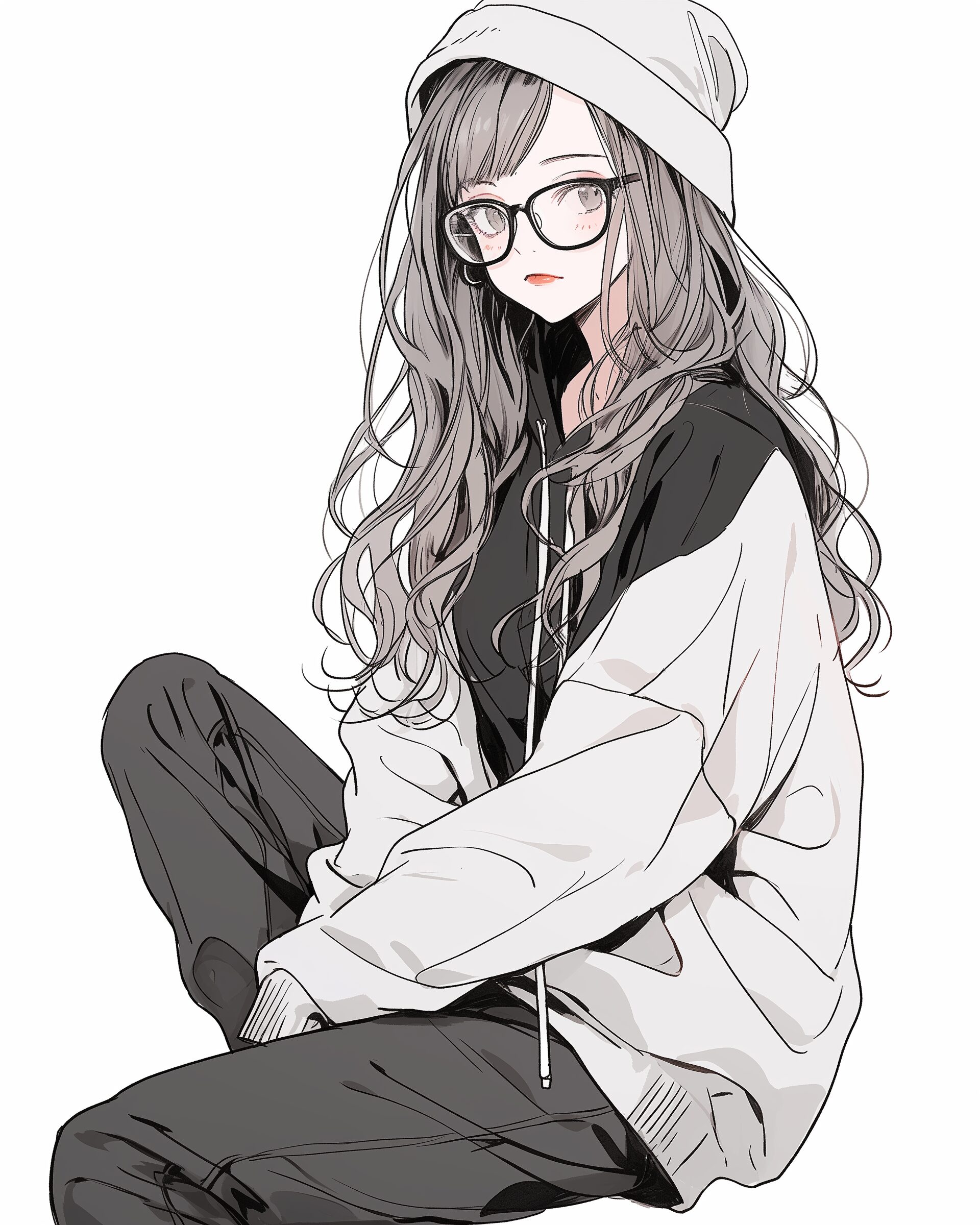 検索タグ:イラスト、ファッション、キャラクター、女性、女、女の子、女子、女の人、アニメ、漫画、マンガ、美人、美女、若い、かわいい、可愛い、カワイイ、人物、顔、美しい、綺麗、きれい、キレイ、アート、お洒落、女子高生、JK、挿絵、夏、春、パステルカラー、春服、インスタ、Instagram、ベージュ、beige、グレー、 grey。座る、座っている、めがね、メガネ、眼鏡