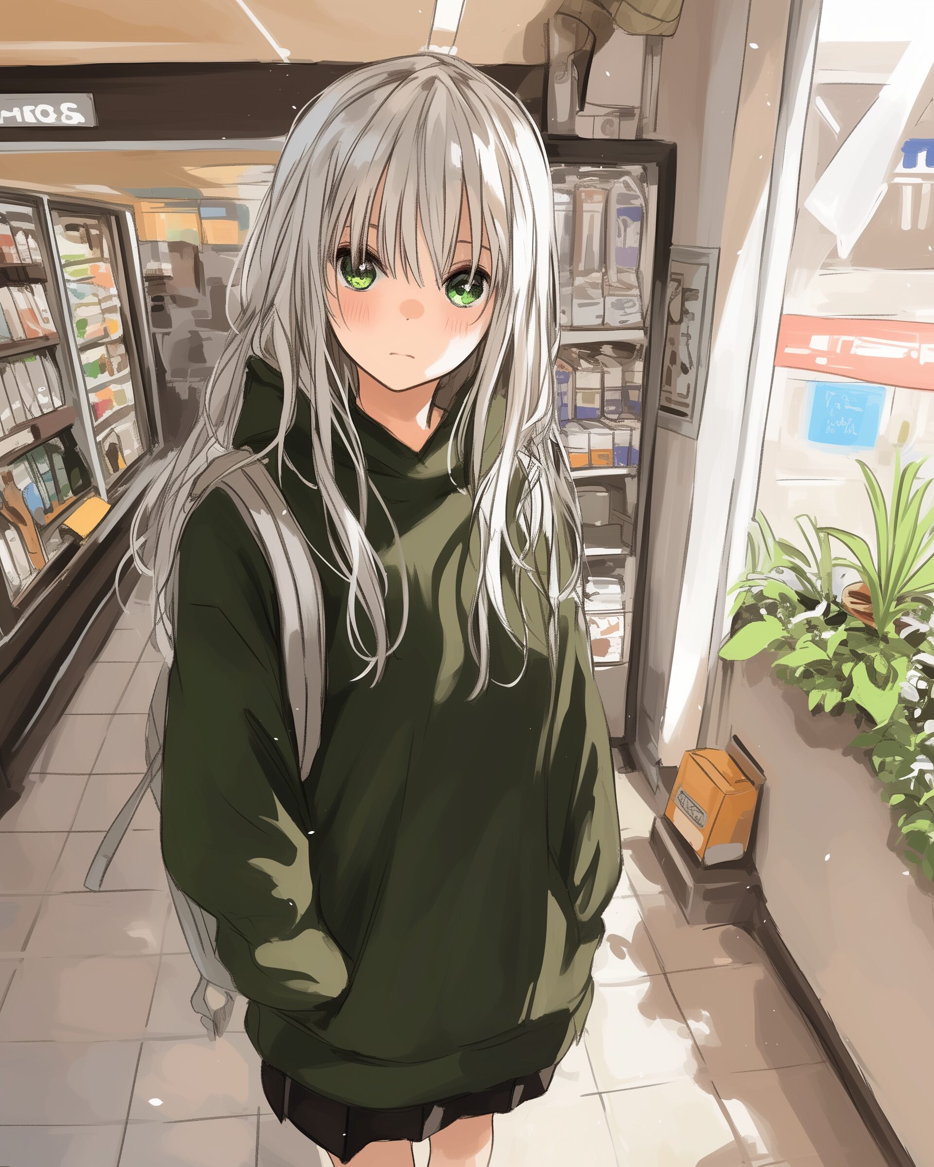 検索タグ:イラスト、ファッション、キャラクター、女性、女、女の子、女子、女の人、アニメ、漫画、マンガ、美人、美女、若い、かわいい、可愛い、カワイイ、人物、顔、美しい、綺麗、きれい、キレイ、アート、お洒落、挿絵、インスタ、Instagram、AI生成画像、fashion、コピースペース、銀髪、パーカー女子、コンビニ、待ち合わせ、お店、店舗