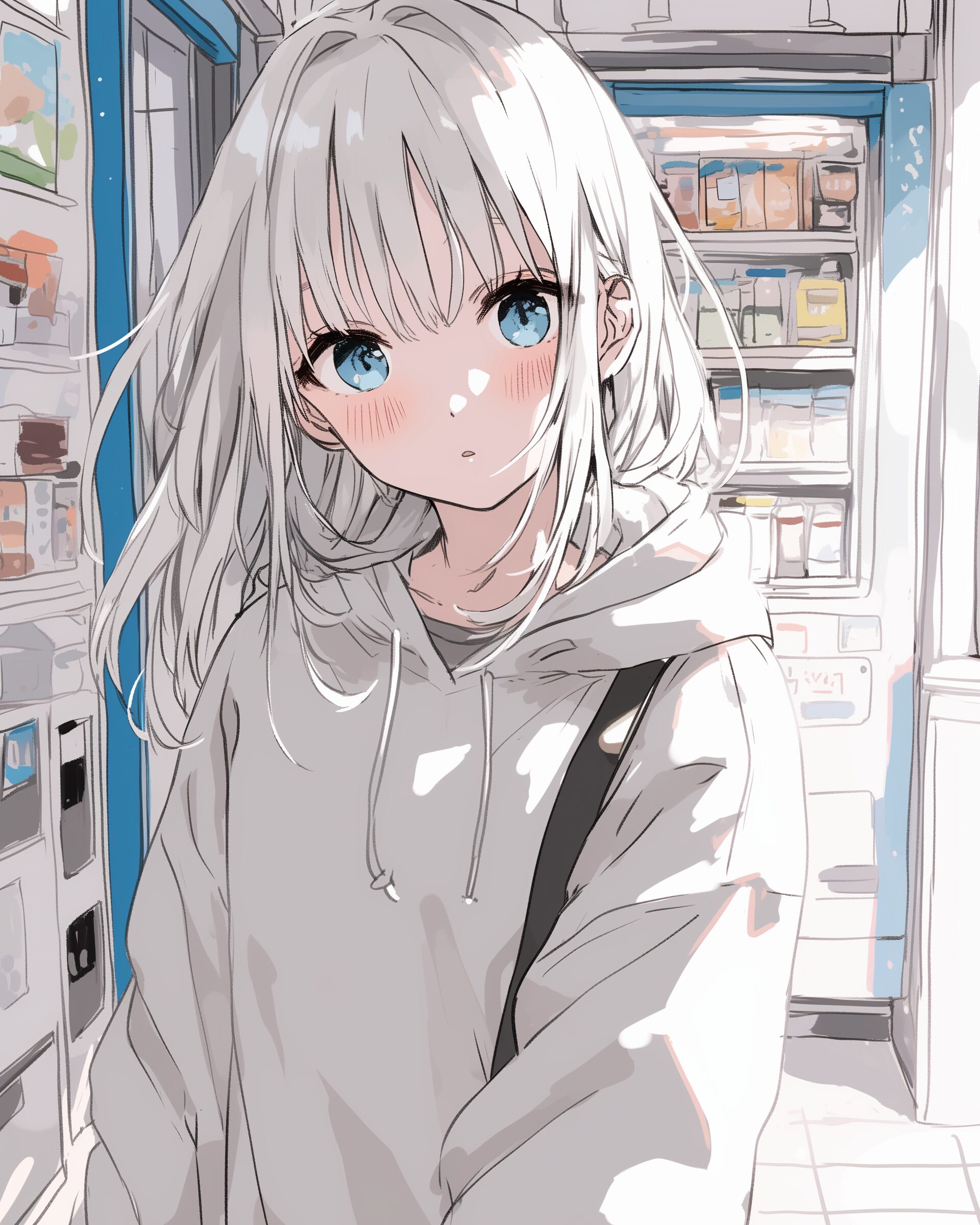 検索タグ:イラスト、ファッション、キャラクター、女性、女、女の子、女子、女の人、アニメ、漫画、マンガ、美人、美女、若い、かわいい、可愛い、カワイイ、人物、顔、美しい、綺麗、きれい、キレイ、アート、お洒落、挿絵、インスタ、Instagram、AI生成画像、fashion、コピースペース、銀髪、パーカー女子、コンビニ、待ち合わせ、お店、店舗