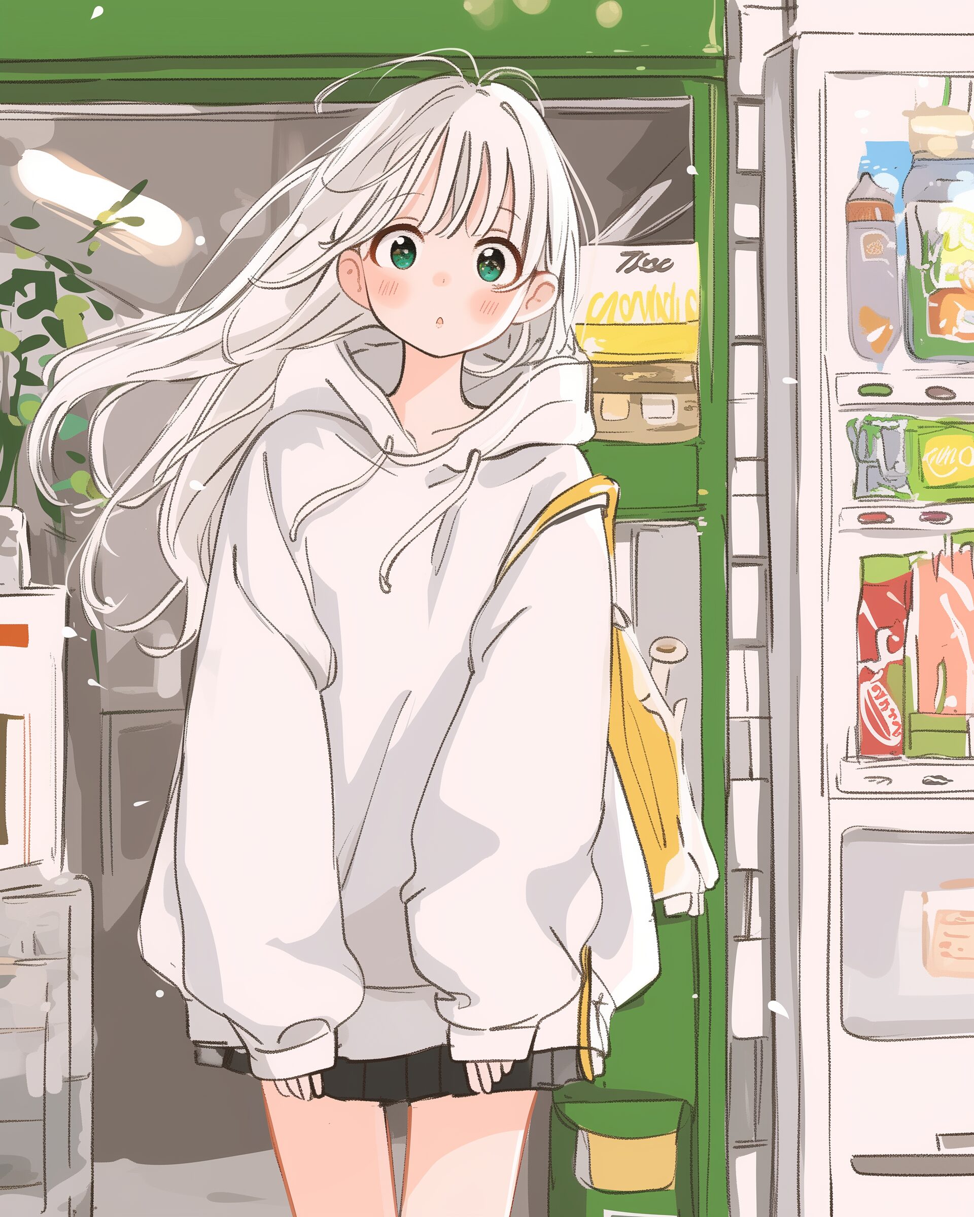 検索タグ:イラスト、ファッション、キャラクター、女性、女、女の子、女子、女の人、アニメ、漫画、マンガ、美人、美女、若い、かわいい、可愛い、カワイイ、人物、顔、美しい、綺麗、きれい、キレイ、アート、お洒落、挿絵、インスタ、Instagram、AI生成画像、fashion、コピースペース、銀髪、パーカー女子、コンビニ、待ち合わせ、お店、店舗