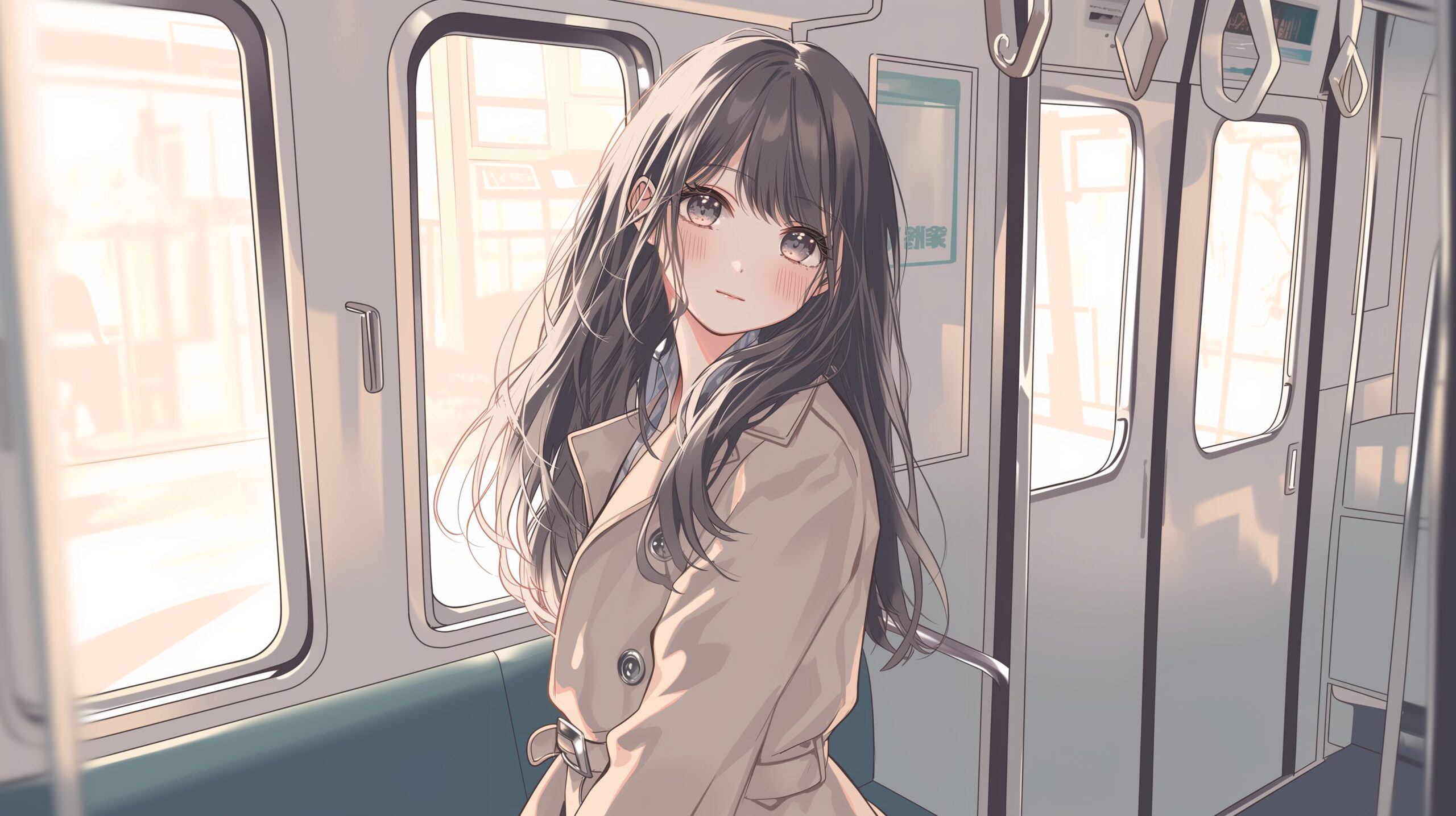 検索タグ:イラスト、ファッション、キャラクター、女性、女、女の子、女子、女の人、アニメ、漫画、マンガ、美人、美女、若い、かわいい、可愛い、カワイイ、人物、顔、美しい、綺麗、きれい、キレイ、アート、お洒落、挿絵、インスタ、Instagram、AI生成画像、fashion、コピースペース、黒髪、トレンチコート、ベージュ、社会人、通勤、電車、ロングヘア、長い髪