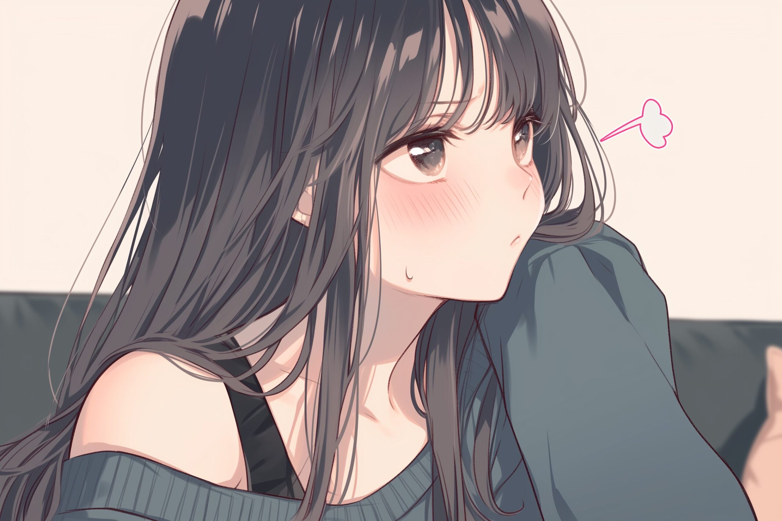 検索タグ:イラスト、ファッション、キャラクター、女性、女、女の子、女子、女の人、アニメ、漫画、マンガ、美人、美女、若い、かわいい、可愛い、カワイイ、人物、顔、美しい、綺麗、きれい、キレイ、アート、お洒落、挿絵、インスタ、Instagram、AI生成画像、fashion、コピースペース、黒髪、ロングヘア、部屋、室内、座る、怒る、拗ねる、やきもち、嫉妬