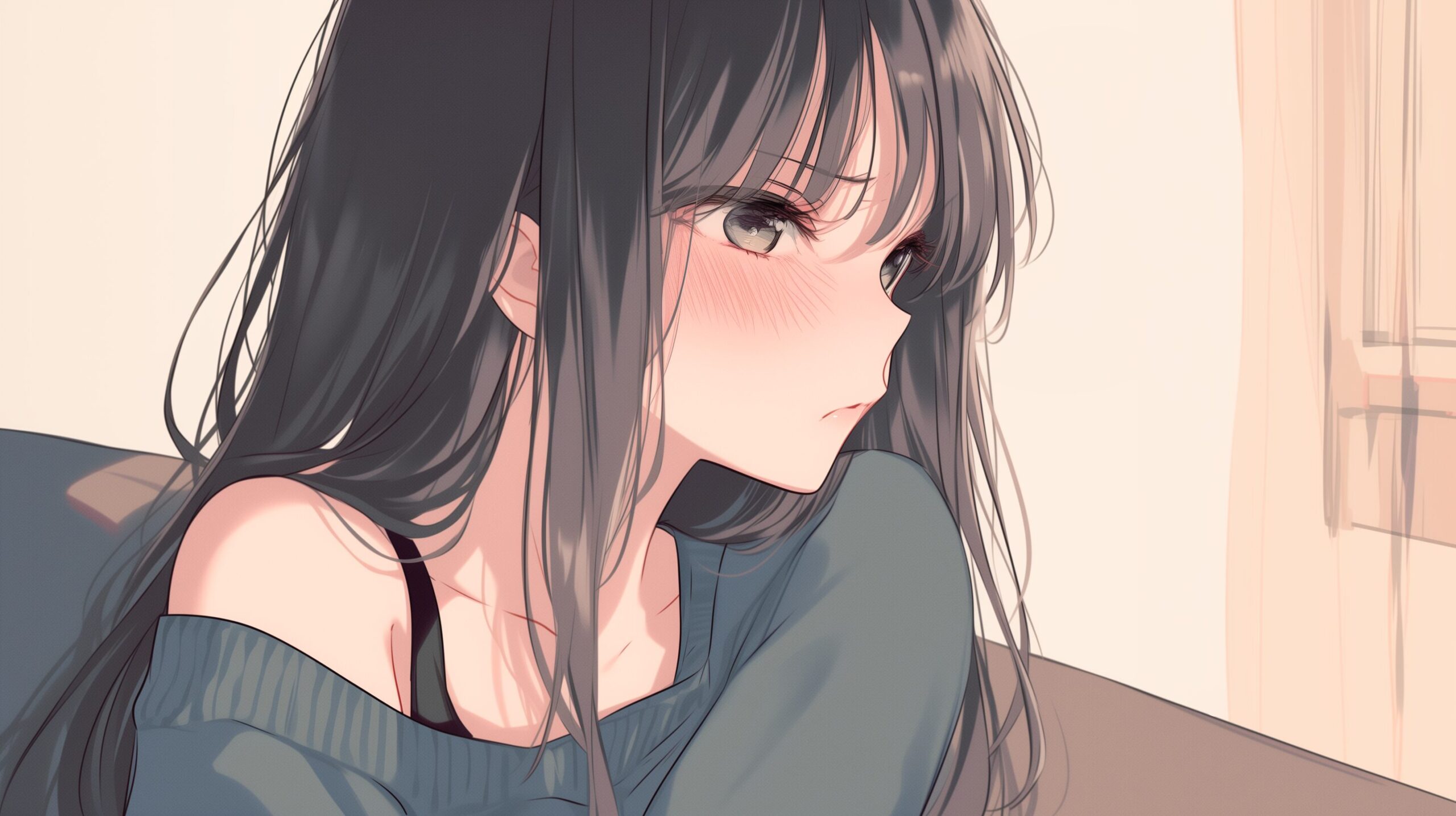 検索タグ:イラスト、ファッション、キャラクター、女性、女、女の子、女子、女の人、アニメ、漫画、マンガ、美人、美女、若い、かわいい、可愛い、カワイイ、人物、顔、美しい、綺麗、きれい、キレイ、アート、お洒落、挿絵、インスタ、Instagram、AI生成画像、fashion、コピースペース、黒髪、ロングヘア、部屋、室内、座る、怒る、拗ねる、やきもち、嫉妬