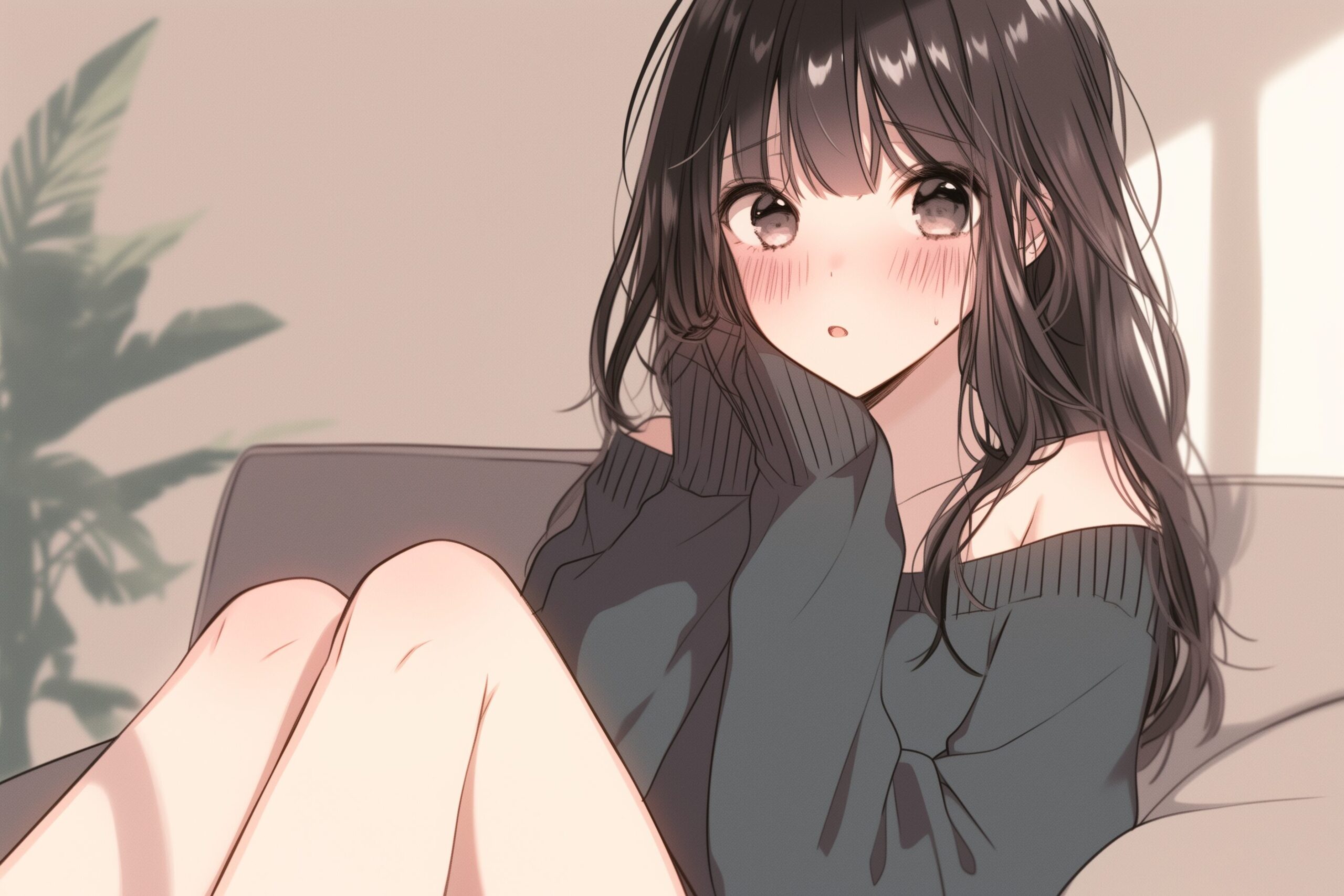 検索タグ:イラスト、ファッション、キャラクター、女性、女、女の子、女子、女の人、アニメ、漫画、マンガ、美人、美女、若い、かわいい、可愛い、カワイイ、人物、顔、美しい、綺麗、きれい、キレイ、アート、お洒落、挿絵、インスタ、Instagram、AI生成画像、fashion、コピースペース、黒髪、ロングヘア、部屋、室内、座る、拗ねる、やきもち、嫉妬