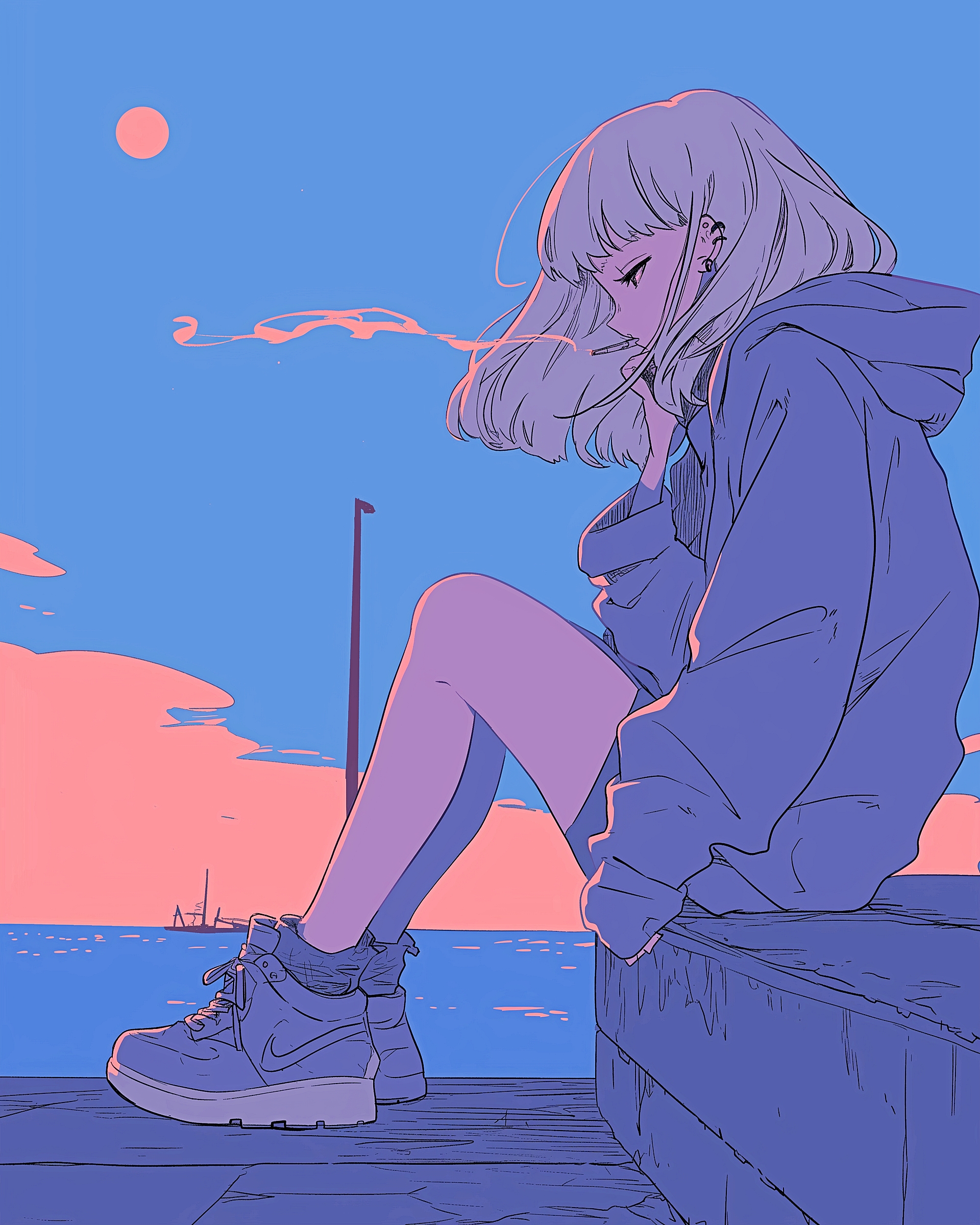 検索タグ:イラスト、ファッション、キャラクター、女性、女、女の子、女子、女の人、アニメ、漫画、マンガ、美人、美女、若い、かわいい、可愛い、カワイイ、萌え、萌え系、萌えキャラ、人物、顔、美しい、綺麗、きれい、キレイ、芸術、アート、顔、AI生成画像、冬服、冬、洋服、お洒落、おしゃれ、オシャレ、ブラック、黒、タバコ、たばこ、煙草、黄昏、たそがれ、パーカー女子