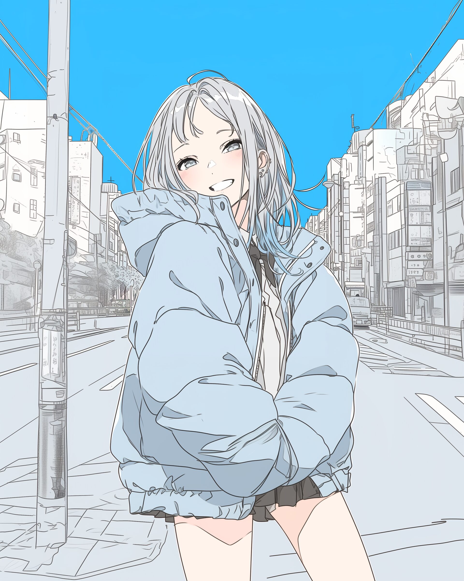 検索タグ:イラスト、ファッション、キャラクター、女性、女、女の子、女子、女の人、アニメ、漫画、マンガ、美人、美女、若い、かわいい、可愛い、カワイイ、人物、顔、美しい、綺麗、きれい、キレイ、アート、お洒落、挿絵、インスタ、Instagram、AI生成画像、fashion、コピースペース、銀髪、笑顔、ダウンジャケット、冬服、冬物、オシャレ、おしゃれ