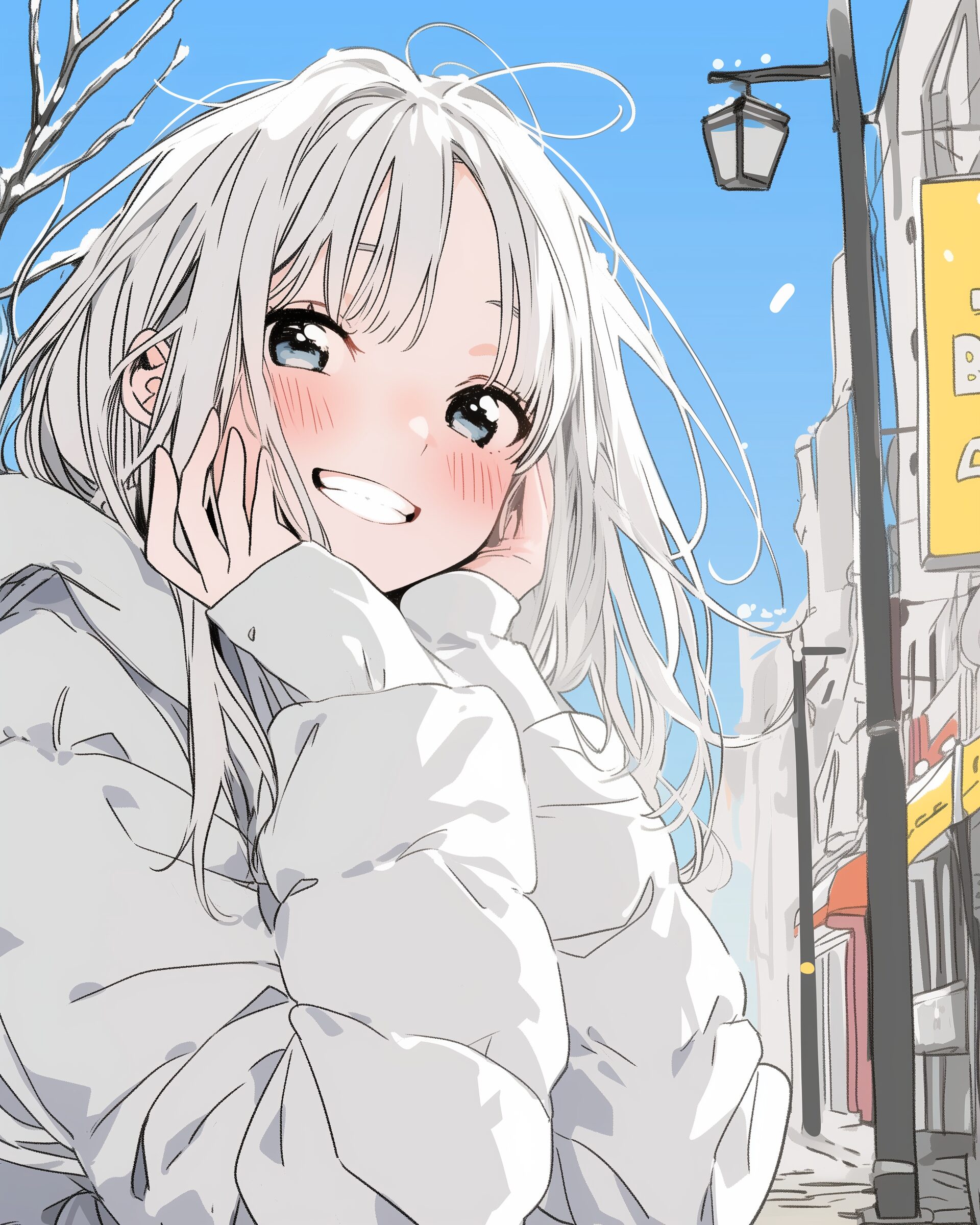 検索タグ:イラスト、ファッション、キャラクター、女性、女、女の子、女子、女の人、アニメ、漫画、マンガ、美人、美女、若い、かわいい、可愛い、カワイイ、人物、顔、美しい、綺麗、きれい、キレイ、アート、お洒落、挿絵、インスタ、Instagram、AI生成画像、fashion、コピースペース、銀髪、笑顔、ダウンジャケット、冬服、冬物、オシャレ、おしゃれ