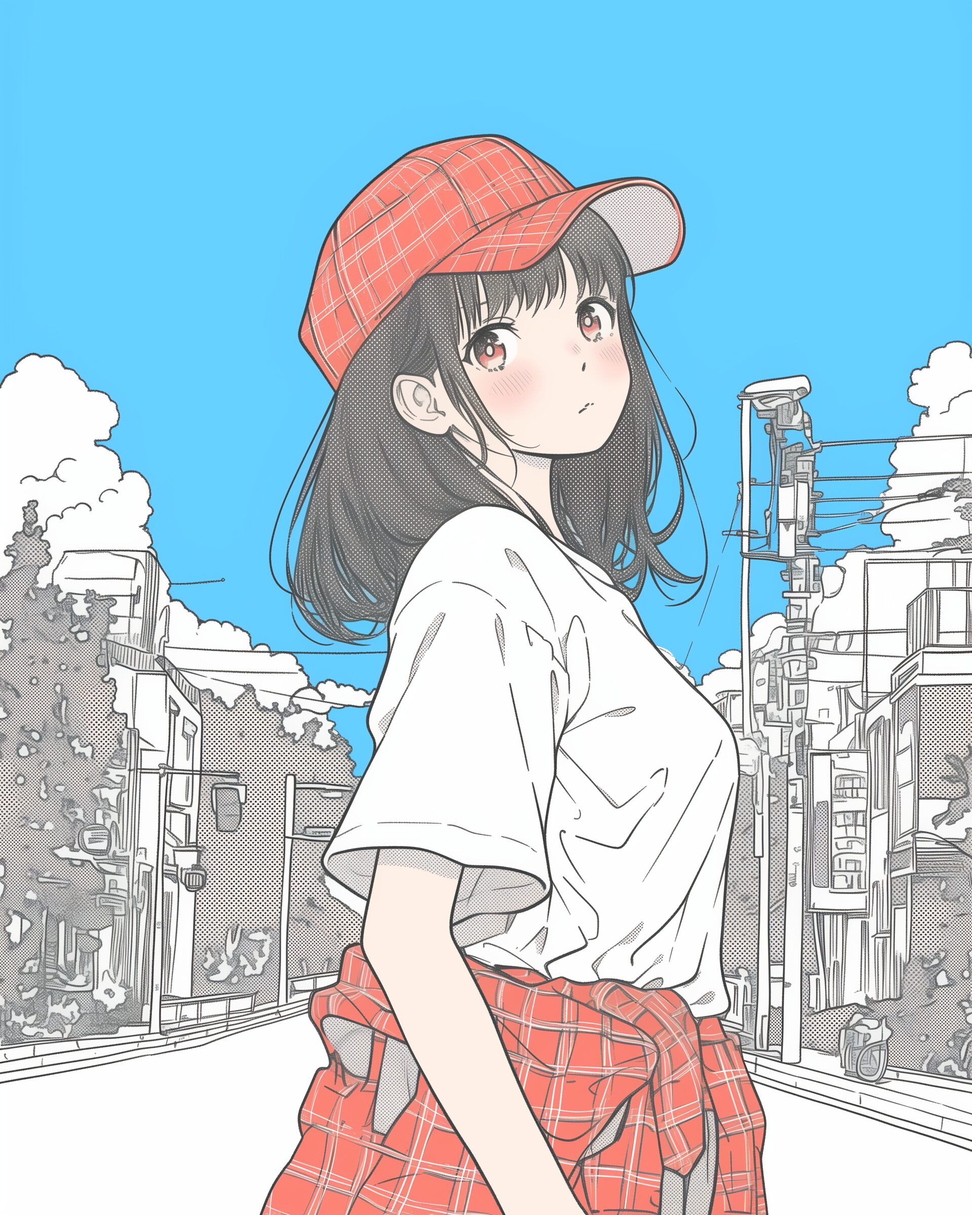 検索タグ:イラスト、ファッション、キャラクター、女性、女、女の子、女子、女の人、アニメ、漫画、マンガ、美人、美女、若い、かわいい、可愛い、カワイイ、人物、顔、美しい、綺麗、きれい、キレイ、アート、お洒落、女子高生、JK、挿絵、夏、春、パステルカラー、春服、インスタ、Instagram、夏、夏服、summer、fashion、サムネイル、アイキャッチ、コピースペース、帽子、赤チェック柄、レッド、RED
