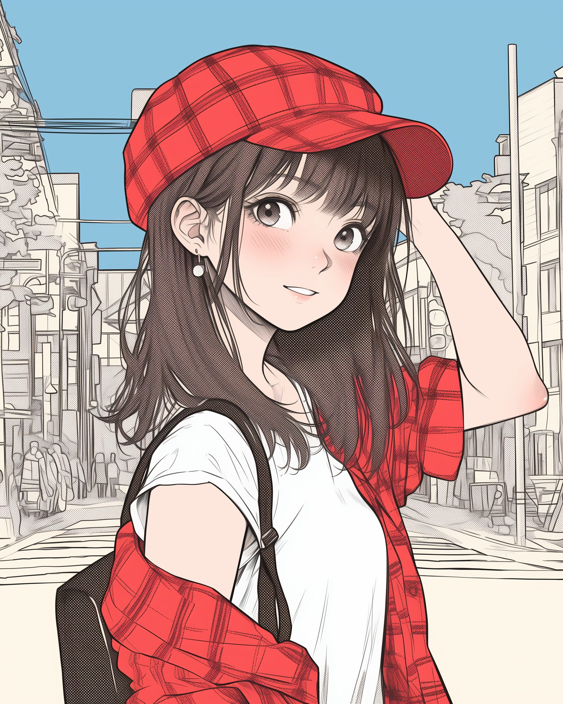 検索タグ:イラスト、ファッション、キャラクター、女性、女、女の子、女子、女の人、アニメ、漫画、マンガ、美人、美女、若い、かわいい、可愛い、カワイイ、人物、顔、美しい、綺麗、きれい、キレイ、アート、お洒落、女子高生、JK、挿絵、夏、春、パステルカラー、春服、インスタ、Instagram、夏、夏服、summer、fashion、サムネイル、アイキャッチ、コピースペース、帽子、赤チェック柄、レッド、RED