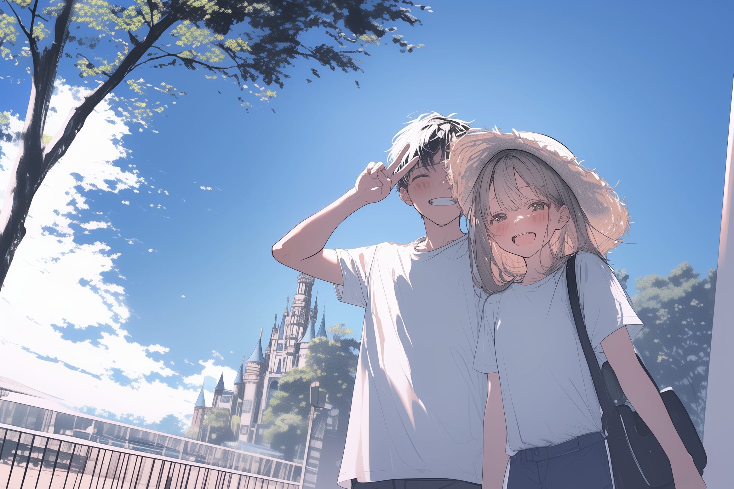 検索タグ:イラスト、ファッション、キャラクター、女性、女、女の子、女子、女の人、アニメ、漫画、マンガ、美人、美女、若い、かわいい、可愛い、カワイイ、人物、顔、美しい、綺麗、きれい、キレイ、アート、お洒落、挿絵、インスタ、Instagram、AI生成画像、コピースペース、カップル、恋人、愛、恋、恋愛、黒髪、笑顔、仲良し、男、男性、夫婦、思い出、想い出、寄り添う、テーマパーク、遊園地、旅行、旅、遊ぶ、お出かけ、城、お城、麦わら帽子、デート