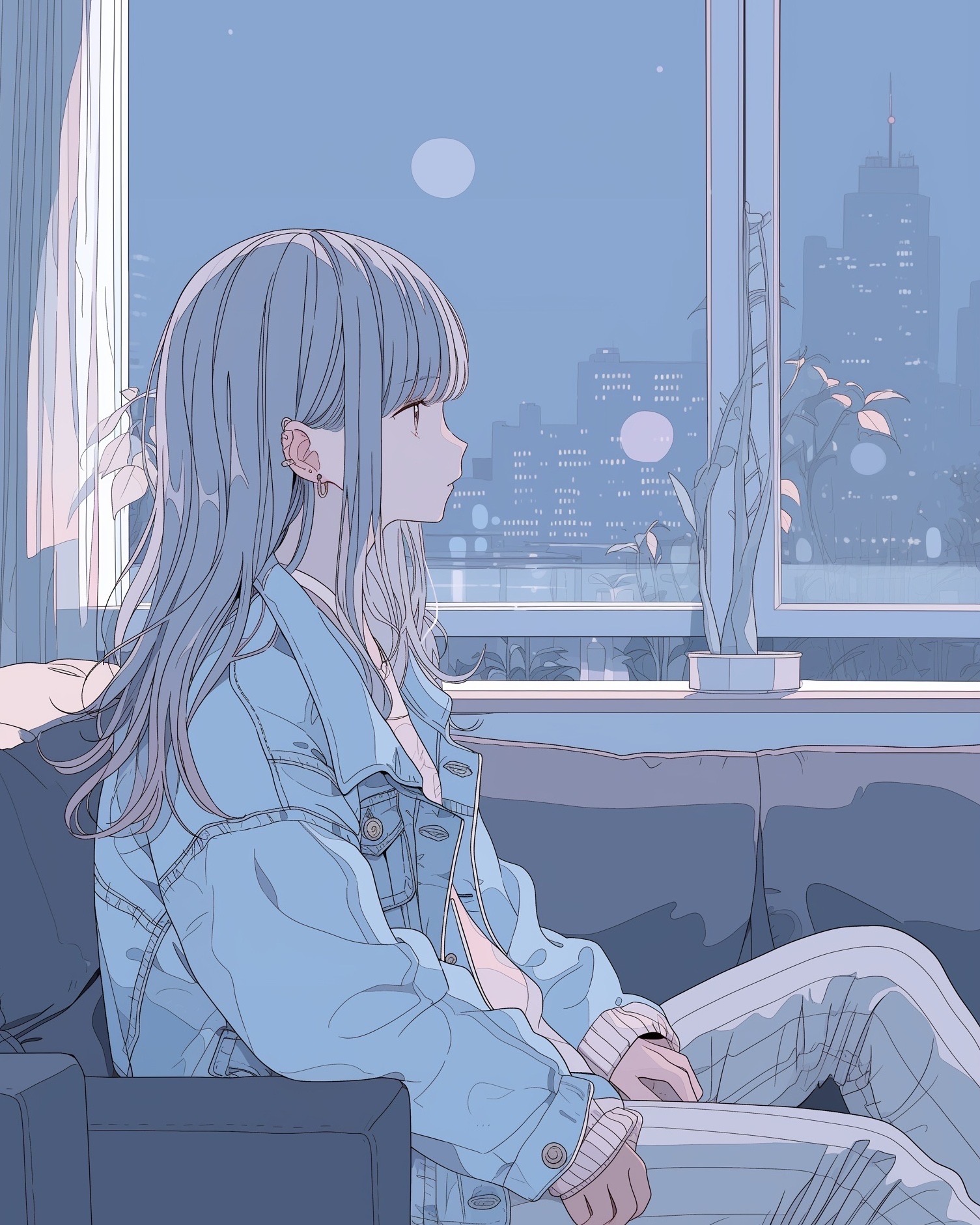 検索タグ:イラスト、ファッション、キャラクター、女性、女、女の子、女子、女の人、アニメ、漫画、マンガ、美人、美女、若い、かわいい、可愛い、カワイイ、人物、顔、美しい、綺麗、きれい、キレイ、アート、洋服、お洒落、女子高生、JK、横顔、切ない、挿絵、夜、青、ブルー、デニムジャケット